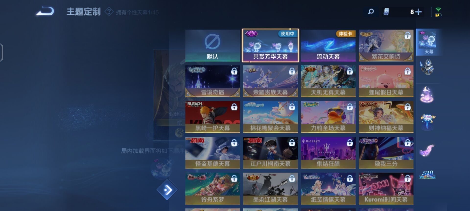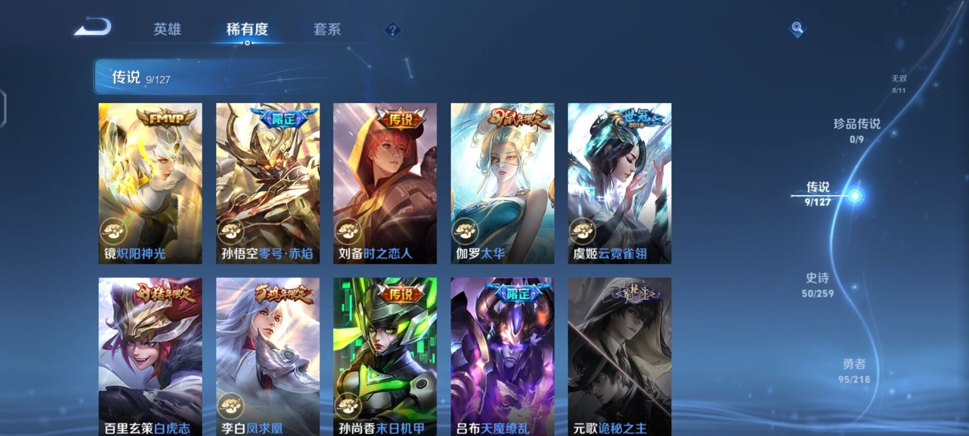 刘邦夺宝奇兵,夏侯惇朔风刀,老夫子醍醐杖,沈梦溪星空之诺,沈梦溪大漠名商,盾山御銮,苏烈千军破阵,典韦穷奇,典韦蓝屏警告,达摩沙漠行僧,牛魔御旌,鲁班七号狮舞东方,吕布猎兽之王,元歌云间偶戏,兰陵王金庭之子,裴擒虎擒涛扼浪,鲁班大师探海日志,明世隐疑决卦,蒙犽狂想玩偶喵,鬼谷子原初探秘者,张良古海寻踪,女娲朔望之晖,桑启海盐诗旅,狄仁杰万华元夜,嬴政白昼王子,芈月重明,程咬金演武夺筹,李元芳银河之约,李元芳云中旅人,弈星混沌棋,米莱狄御霄,钟馗神迹守卫,钟馗驱傩正仪,狂铁御狮