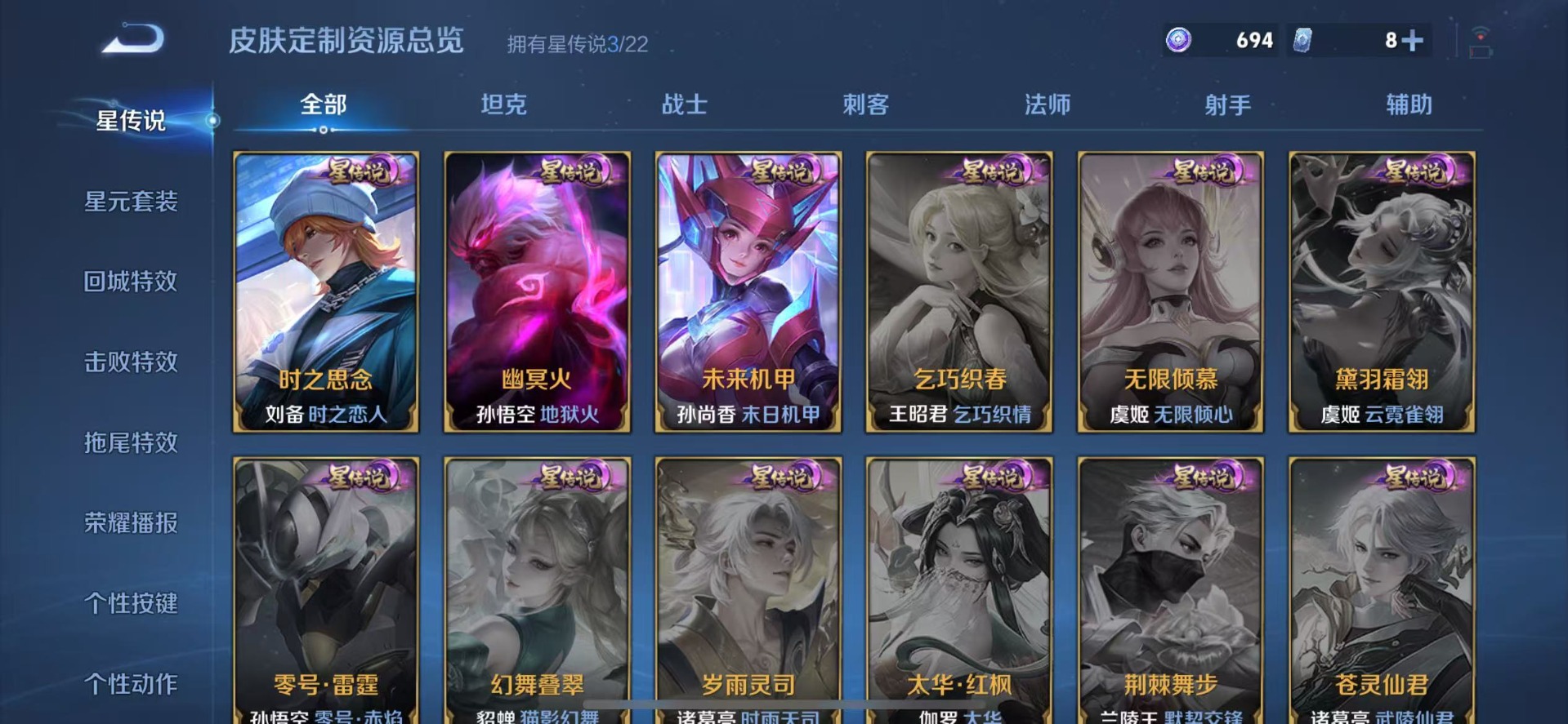 大乔白鹤梁神女,伽罗天狼溯光者,裴擒虎李小龙,上官婉儿梁祝,李白诗剑行,猪八戒猪悟能,孙悟空大圣娶亲,孙悟空至尊宝,百里玄策白虎志,百里守约朱雀志,澜愿照·九州拓,虞姬愿照·岁时盈,王昭君凤凰于飞