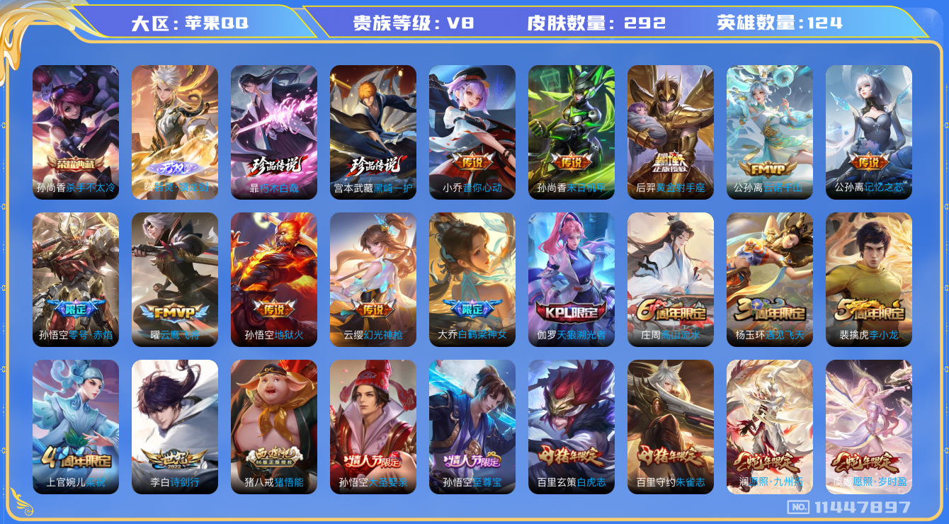 [11447897]V8 1典藏 1无双 2珍品传说 14传说 124英雄 292皮肤 可修改实名 优质装备:杀手不太冷,器灵·螭龙剑,朽木白哉,黑崎一护,黄金射手座,云鹰飞将(小将军),末日机甲-孙尚香(绿蚂蚱),地狱火,音你心动-小乔,零号·赤焰,记忆之芯(机甲兔),涂山容容 传说皮:云诺千山,幻光神枪 珍宝阁皮:优雅恋人 限定皮:愿照·九州拓(澜年限),愿照·岁时盈(虞姬年限),至尊宝,白虎志(电光耗子),凤凰于飞,白鹤梁神女,遇见飞天,高山流水,诗剑行,梁祝,天狼溯光者,李小龙,朱雀志(守约年限),猪悟能,大圣娶亲 史诗皮:鸭鸭历险记-刘禅,器灵·浮梦炉,狼魂孤将,化蝶舞,龙之律动,石田雨龙,百相守梦-周瑜,茶境仙,白龙吟,黄金分割率,特工魅影,千年之狐,蒙恬荣光圣徽,冰冠公主,青蛇,晚萤,末日机甲-吕布,猫狗日记-孙策,猫狗日记-大乔,乱世虎臣,节奏热浪,修罗,女仆咖啡,摇滚巨星,水果甜心,星夜王子,功夫厨神,暗隐猎兽者,幽灵船长,鬼剑武藏,乐园奇幻夜,地狱岩魂,纤云弄巧,繁星吟游(呼啦呼啦),乘风破浪,逐浪之夏,曙光守护者,金属风暴,原初追逐者,圣诞狂欢,圣诞恋歌,鹰眼统帅,魅力维加斯,黎明之约
