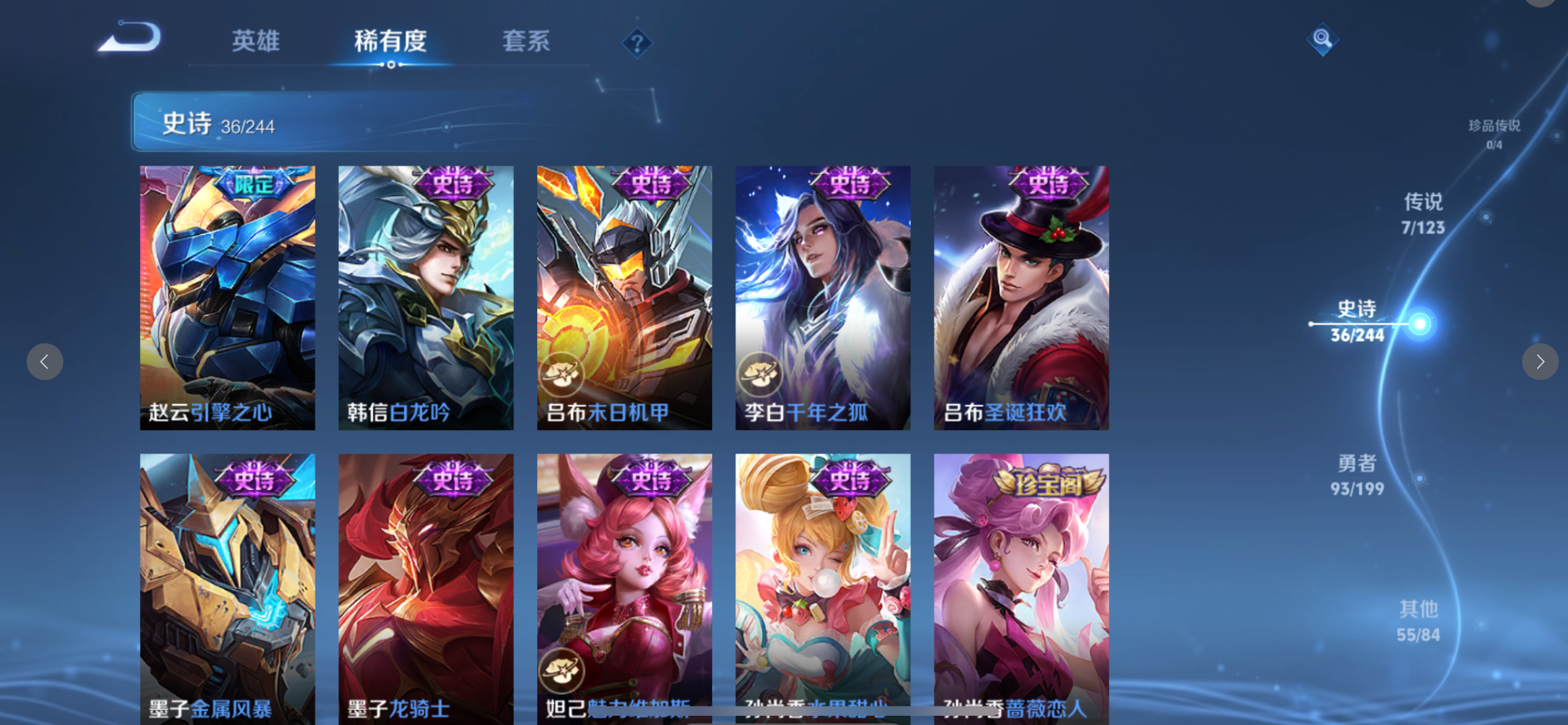 扁鹊炼金王,虞姬凯尔特女王,白起狰,太乙真人饕餮,曹操烛龙,芈月重明,典韦穷奇,狂铁御狮,米莱狄御霄,牛魔御旌,盾山御銮,夏侯惇朔风刀,明世隐疑决卦,老夫子醍醐杖,鬼谷子原初探秘者,程咬金演武夺筹,钟馗驱傩正仪,苏烈千军破阵,沈梦溪星空之诺,李元芳银河之约,刘邦夺宝奇兵,弈星混沌棋,达摩沙漠行僧,兰陵王金庭之子,沈梦溪大漠名商,李元芳云中旅人,桑启海盐诗旅,裴擒虎擒涛扼浪,鲁班大师探海日志,张良古海寻踪,项羽苍威无极,镜青焰无极