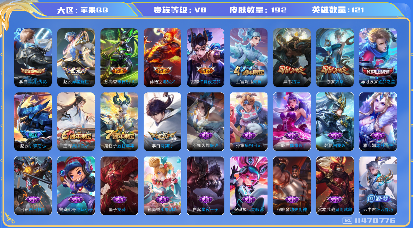 - [11608700]V8 2典藏 1珍品传说 25传说 123英雄 283皮肤 可修改实名 优质装备:鸣剑·曳影,星域神启(倪克斯贼亮),朽木白哉,黄金射手座,云鹰飞将(小将军),炽阳神光,一念神魔,末日机甲-孙尚香(绿蚂蚱),仲夏夜之梦(大飞蛾),零号·赤焰,地狱之眼,无双飞将,记忆之芯(机甲兔),电玩·雷克斯,澜逐花归海,涂山容容 传说皮:典韦战鼓燎原,祥瑞亨通 珍宝阁皮:妄想食味,万物之道 限定皮:愿照·九州拓(澜年限),愿照·福禄聚(蔡文姬年限),愿照·岁时盈(虞姬年限),愿照·山河定(司空震年限),愿照·众生和(妲己年限),愿照·千秋盛(女娲年限),逐霄战戟,陌上桑,鸣野蒿,至尊宝,傲雪梅枪,诗剑行,齐天大圣,五谷丰年,李小龙,孙行者,深海之息(深海大菠萝) 史诗皮:鸭鸭历险记-刘禅,器灵·浮梦炉,狼魂孤将,绮世丹青,瑰影绮梦,化蝶舞,灵蛊蚀心,谪仙醉月,龙之律动,雪豹·霜爪,百相守梦-周瑜,茶境仙,炽弈燎原,破空之剑,蒙犽顽岩魄,埋骨钱,琥珀纪元伽罗,蔬乡物语(鲁班七号),超元猎域,星界特工,百相守梦-黄忠,紫霞仙子,白龙吟,黄金分割率,特工魅影,江河有灵,百解令(蒙犽),高渐离燃音魔法,青蛇,偶像歌手,晚萤,猫狗日记-孙策,乱世虎臣,节奏热浪,摇滚巨星,水果甜心,星夜王子,功夫厨神,德古拉伯爵,暗隐猎兽者,幽灵船长,鬼剑武藏,暗渊魔法,天秀·启明,舞动绿茵,地狱岩魂,诗语江南,纤云弄巧,拒霜思,逐浪之夏,水晶猎龙者,曙光守护者,箭羽风息,金属风暴,原初追逐者,圣诞狂欢,圣诞恋歌,鹰眼统帅,暗夜贵公子,赏金猎手,未来纪元-赵云