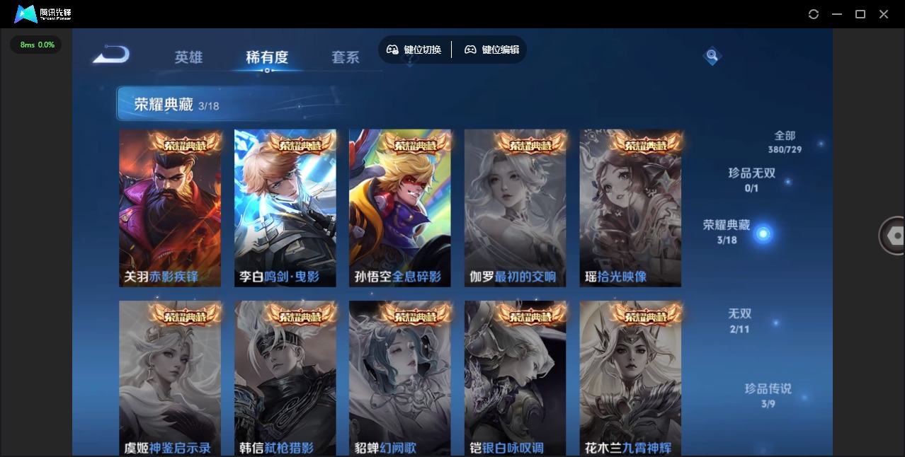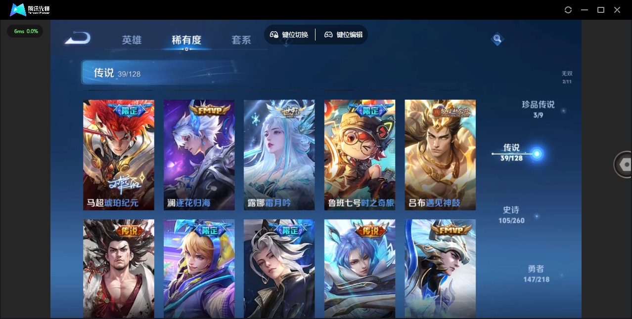 - [11632839]V6 1典藏 1珍品传说 2传说 123英雄 220皮肤 可修改实名 荣耀水晶:鸣剑·曳影 珍品传说:怪盗基德 传说皮:一念神魔 珍宝阁皮:胡桃夹子,玩趣恶龙 限定皮:鸣野蒿,神威(电光马子),高山流水,五谷丰年,李小龙,朱雀志(守约年限),孙行者,山海·玄木吟(马可年限) 史诗皮:星界战将,鸭鸭历险记-刘禅,蒙犽顽岩魄,紫霞仙子,苍穹之光,电玩小子(小书包),特工魅影,千年之狐,蒙恬荣光圣徽,偶像歌手,猫狗日记-孙策,猫狗日记-大乔,乱世虎臣,节奏热浪,女仆咖啡,水果甜心,绅士熊喵,天才门将,星夜王子,时之奇旅-安琪拉,功夫厨神,暗隐猎兽者,幽灵船长,鬼剑武藏,心灵战警,天秀·启明,舞动绿茵,地狱岩魂,纤云弄巧,拒霜思,缤纷独角兽,乘风破浪,逐浪之夏,水晶猎龙者,金属风暴,原初追逐者,圣诞狂欢,圣诞恋歌,鹰眼统帅,魅力维加斯,黎明之约,千筹问战,无心,未来纪元-赵云