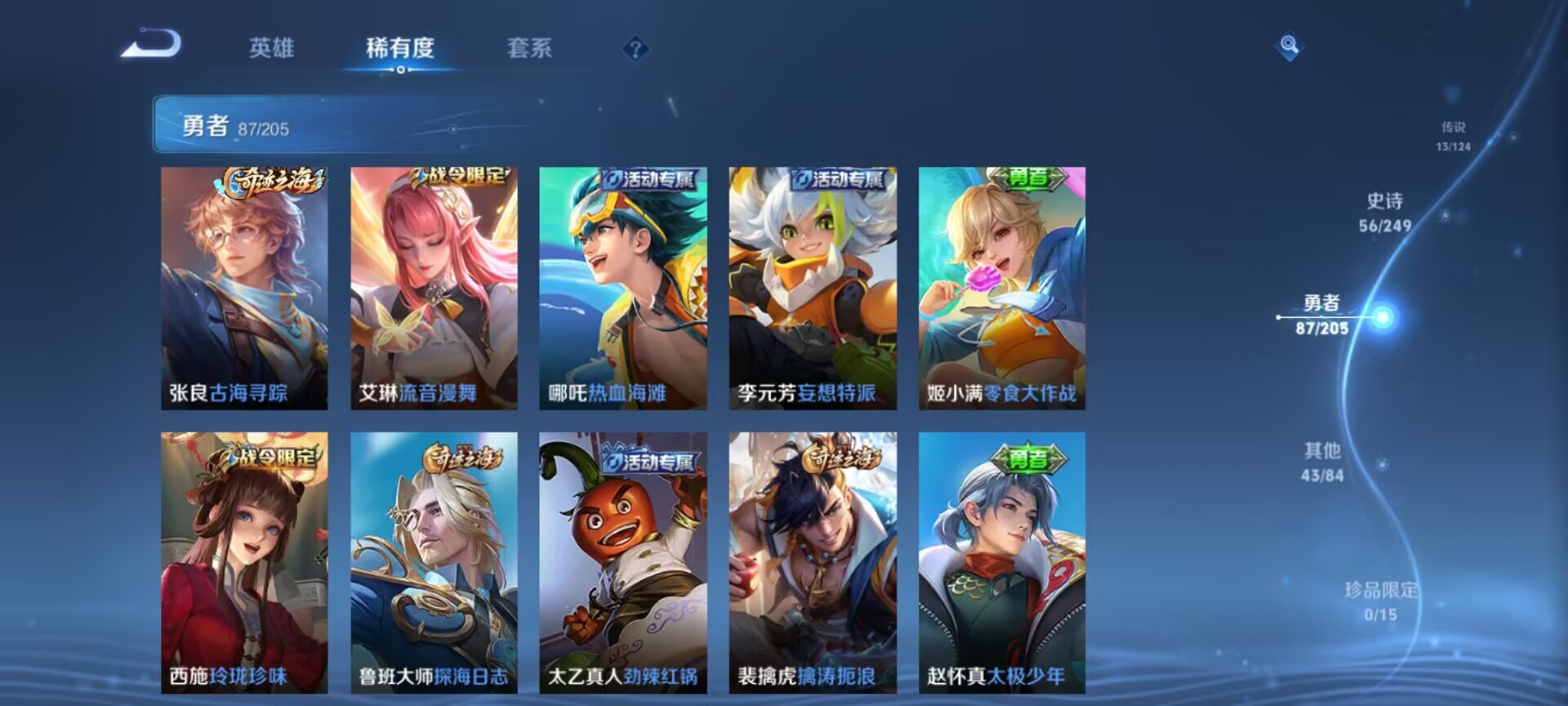 娜可露露晚萤,李元芳逐浪之夏,孙策猫狗日记,阿轲节奏热浪,诸葛亮黄金分割率,吕布末日机甲,橘右京修罗,刘禅天才门将,白起星夜王子,程咬金功夫厨神,刘邦德古拉伯爵,兰陵王暗隐猎兽者,曹操幽灵船长,宫本武藏鬼剑武藏,杨戬天秀·启明,蔡文姬舞动绿茵,小乔缤纷独角兽,夏侯惇乘风破浪,花木兰水晶猎龙者,墨子金属风暴,貂蝉圣诞恋歌,嫦娥拒霜思,雅典娜黎明之约,夏洛特永昼,刘备百相守梦,刘禅电玩·爆裂旋风,蒙犽百解令,赵怀真器灵·浮梦炉