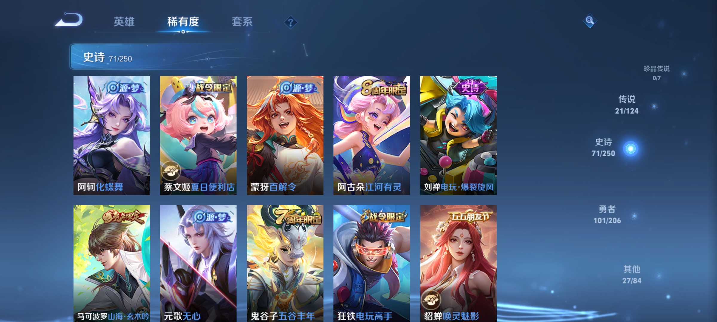 米莱狄御霄,明世隐疑决卦,老夫子醍醐杖,鬼谷子原初探秘者,狄仁杰万华元夜,程咬金演武夺筹,钟馗驱傩正仪,苏烈千军破阵,鲁班七号狮舞东方,马可波罗暗影游猎,蒙犽狂想玩偶喵,元歌云间偶戏,达摩沙漠行僧,兰陵王金庭之子,沈梦溪大漠名商,李元芳云中旅人,桑启海盐诗旅,裴擒虎擒涛扼浪,鲁班大师探海日志,张良古海寻踪