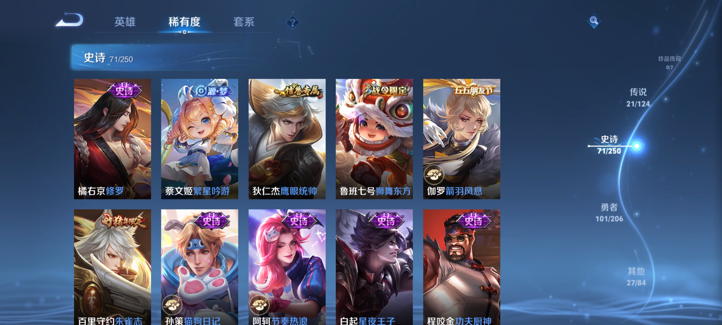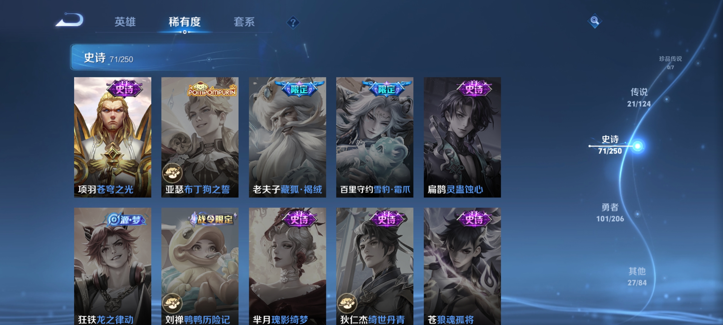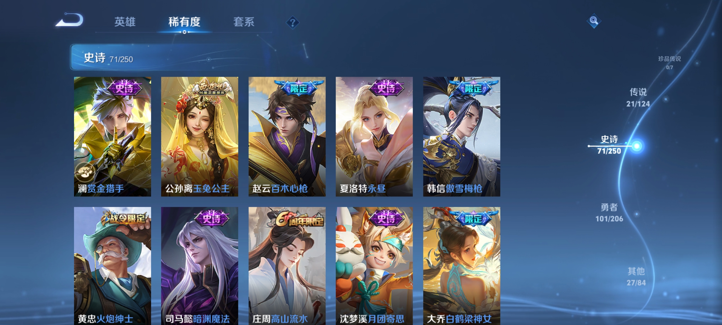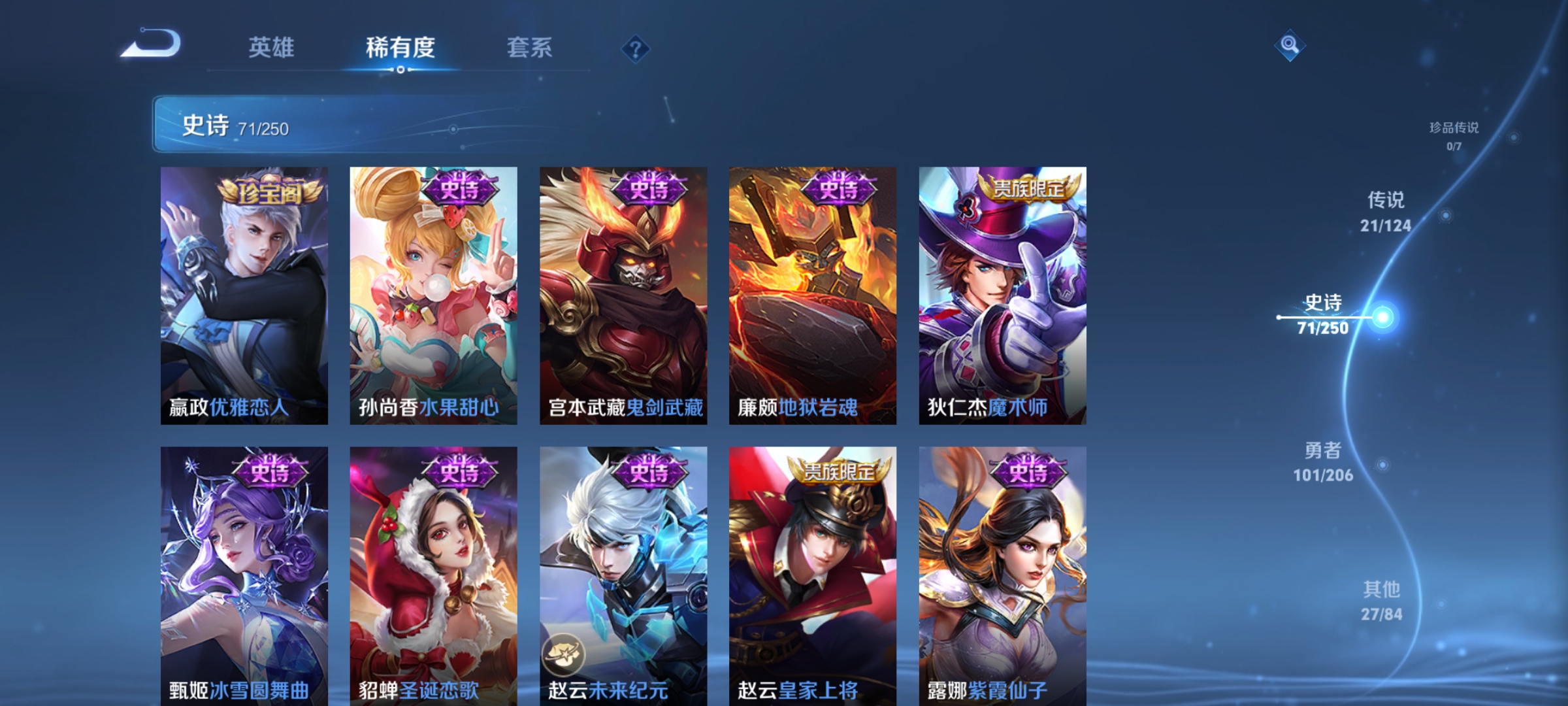 [11470757]关羽典藏,武则天,小将军,李逍遥,电光耗子,仲夏夜,武陵仙君,玉兔公主,白鹤梁神女,紫霞,至尊宝,马可年限,-可二次-123英雄-221皮肤-1典藏-21传说-71史诗 炽阳神光-镜 山海·苍雷引-曜 白虎志-百里玄策 山海·炽霜斩-李信 武陵仙君-诸葛亮 山海·玄木吟-马可波罗 冰冠公主-雅典娜 天狼绘梦者-上官婉儿 神威-马超 至尊宝-孙悟空 街头霸王-韩信