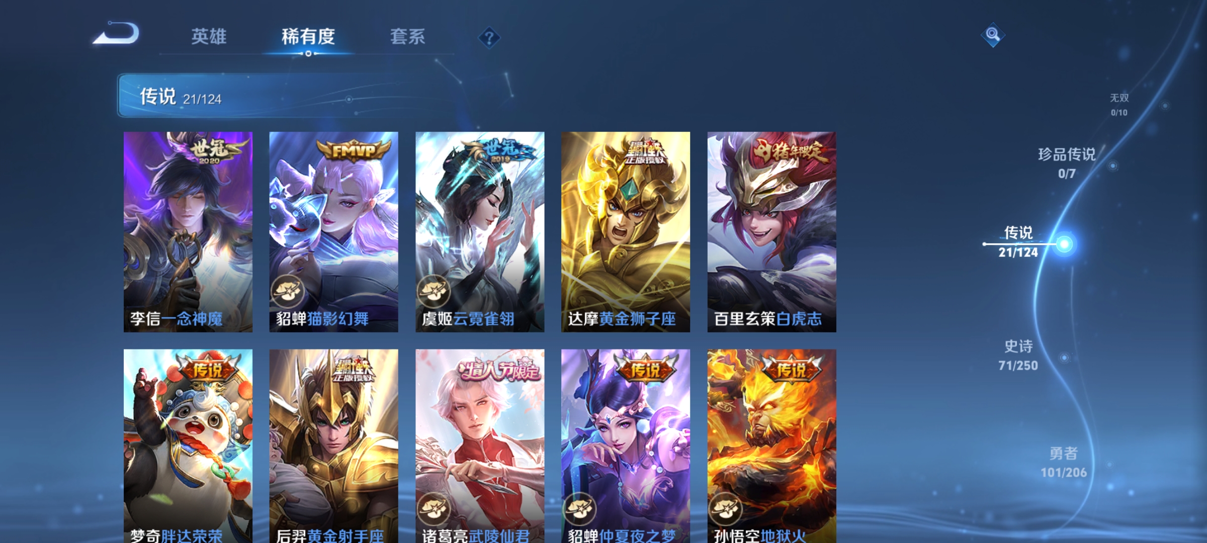 - [11657642]V7 9传说 106英雄 102皮肤 可修改实名 优质装备:黄金射手座,零号·赤焰,飞鸢探春,时之恋人-刘备(电焊工),挚爱之约,记忆之芯(机甲兔),遇见神鼓,鲁班七号-时之奇旅 珍宝阁皮:蔷薇恋人 限定皮:影龙天霄,五谷丰年,游园惊梦,逐梦之音,李小龙,逐梦之影,乒乒小将 史诗皮:糖绘人间,化蝶舞,东方月初,海诺心动手记,白龙吟,黄金分割率,江河有灵,真我赫兹(百里守约),百解令(蒙犽),时之恋人-孙尚香,节奏热浪,女仆咖啡,摇滚巨星,水果甜心,心灵骇客,缤纷独角兽,曙光守护者,鹰眼统帅,魅力维加斯,未来纪元-赵云