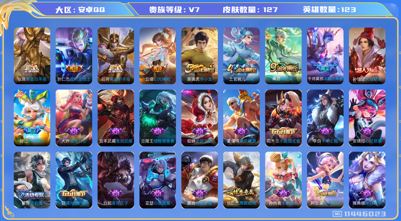 [11446023]V7 5传说 123英雄 127皮肤 可修改实名 优质装备:黄金射手座,黄金白羊座,超时空战士-狄仁杰 传说皮:幻光神枪 限定皮:鸣野蒿,梁祝,李小龙,大圣娶亲,冰霜恋舞曲,热情桑巴 史诗皮:蒙犽顽岩魄,紫霞仙子,白龙吟,黄金分割率,特工魅影,千年之狐,江河有灵,冰冠公主,猫狗日记-大乔,摇滚巨星,水果甜心,星夜王子,心灵骇客,暗隐猎兽者,鬼剑武藏,心灵战警,繁星吟游(呼啦呼啦),乘风破浪,逐浪之夏,水晶猎龙者,曙光守护者,圣诞狂欢,圣诞恋歌,鹰眼统帅,魅力维加斯