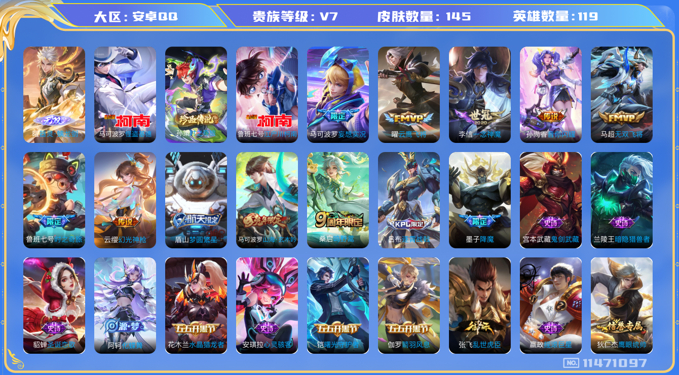 - [12091683]V7 7传说 125英雄 294皮肤 可修改实名 优质装备:黄金狮子座,久胜战神,一念神魔,末日机甲-孙尚香(绿蚂蚱) 珍宝阁皮:妄想食味,优雅恋人,玩趣恶龙 限定皮:逐霄战戟,鸣野蒿,至尊宝,凤求凰(白切鸡),时雨天司(水龙头),神威(电光马子),飞衡(韩信年限),遇见飞天,高山流水,五谷丰年,梁祝,天狼绘梦者,李小龙,逐梦之影,朱雀志(守约年限),默契交锋-花木兰,孙行者,猪悟能,大圣娶亲,冰霜恋舞曲,匿光追影者,时之祈愿-云中君 史诗皮:紫霞仙子,苍穹之光,电玩小子(小书包),黄金分割率,特工魅影,千年之狐,江河有灵,雪夜绮愿(周瑜),魅语,冰冠公主,晚萤,暗夜猫娘,龙骑士(小龙虾),末日机甲-吕布,猫狗日记-孙策,猫狗日记-大乔,乱世虎臣,节奏热浪,修罗,女仆咖啡,摇滚巨星,水果甜心,天才门将,星夜王子,心灵骇客,时之奇旅-安琪拉,功夫厨神,德古拉伯爵,暗隐猎兽者,幽灵船长,鬼剑武藏,心灵战警,地狱岩魂,纤云弄巧,繁星吟游(呼啦呼啦),拒霜思,缤纷独角兽,乘风破浪,逐浪之夏,水晶猎龙者,曙光守护者,箭羽风息,金属风暴,原初追逐者,圣诞狂欢,圣诞恋歌,鹰眼统帅,王者之锤,暗夜贵公子,魅力维加斯,黎明之约,无心,未来纪元-赵云