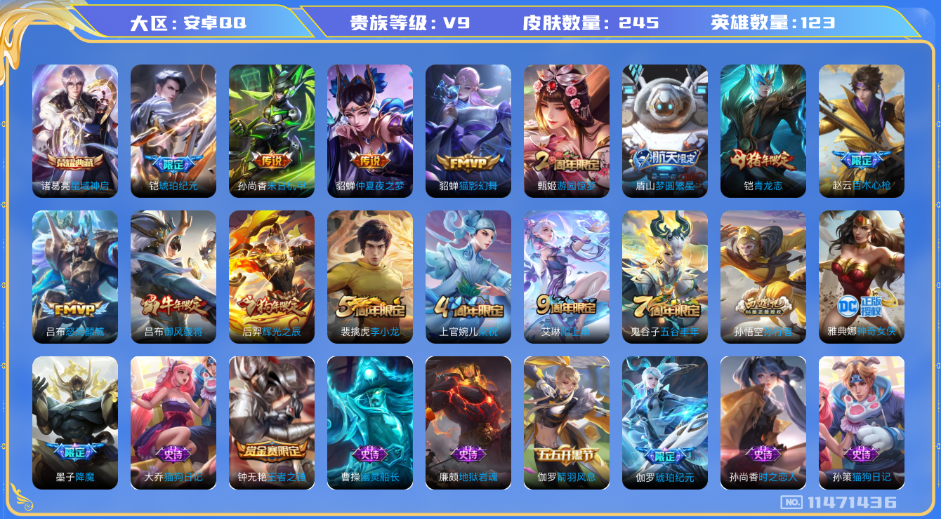 [11471436]V9 1典藏 6传说 123英雄 245皮肤 可修改实名 女号 优质装备:星域神启(倪克斯贼亮),猫影幻舞,末日机甲-孙尚香(绿蚂蚱),仲夏夜之梦(大飞蛾),琥珀纪元铠 珍宝阁皮:优雅恋人,蔷薇恋人 限定皮:陌上桑,怒海麟威,降魔,五谷丰年,青龙志(铠年限),游园惊梦,梁祝,御风骁将(吕布年限),李小龙,辉光之辰,孙行者,神奇女侠,百木心枪,梦圆繁星 史诗皮:谪仙醉月,琥珀纪元伽罗,紫霞仙子,苍穹之光,电玩小子(小书包),黄金分割率,特工魅影,千年之狐,永昼,江河有灵,百解令(蒙犽),魅语,无限星赏官,晚萤,末日机甲-吕布,猫狗日记-孙策,猫狗日记-大乔,时之恋人-孙尚香,修罗,女仆咖啡,摇滚巨星,水果甜心,绅士熊喵,天才门将,心灵骇客,暗隐猎兽者,幽灵船长,鬼剑武藏,地狱岩魂,纤云弄巧,逐浪之夏,水晶猎龙者,箭羽风息,唤灵魅影,金属风暴,原初追逐者,圣诞恋歌,鹰眼统帅,王者之锤,暗夜贵公子,魅力维加斯,赏金猎手,奇遇舞章,无心
