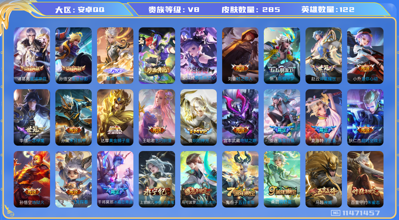 [11471457]V8 2典藏 1无双 2珍品传说 18传说 122英雄 285皮肤 可修改实名 优质装备:全息碎影(猴子典藏),星域神启(倪克斯贼亮),器灵·螭龙剑,酷洛米之心,黄金狮子座,炽阳神光,一念神魔,地狱火,音你心动-小乔,地狱之眼,飞鸢探春,乞巧织情,时之恋人-刘备(电焊工),淬星耀世,超时空战士-狄仁杰,末日机甲-孙策,浮生妄,百相守梦(张飞) 珍品传说:时之奇旅-孙策 传说皮:落雪白狼 珍宝阁皮:妄想食味,蔷薇恋人 限定皮:愿照·岁时盈(虞姬年限),鸣野蒿,神威(电光马子),五谷丰年,朱雀志(守约年限),冰霜恋舞曲,神器·万象笔,山海·玄木吟(马可年限) 史诗皮:茶境仙,飞车小橘子,糖绘人间,化蝶舞,鸭鸭历险记-刘禅,龙之律动,藏狐·褐绒,星界战将,百相守梦-百里守约,破空之剑,战舞者,蒙犽顽岩魄,怒海争锋,蔬乡物语(鲁班七号),黄金分割率,特工魅影,千年之狐,永昼,电玩·爆裂旋风,匿光破解者,末日机甲-莱西奥,匿光侦查者,江河有灵,高渐离燃音魔法,龙骑士(小龙虾),蒙恬荣光圣徽,无限星赏官,晚萤,偶像歌手,猫狗日记-孙策,乱世虎臣,节奏热浪,修罗,女仆咖啡,水果甜心,绅士熊喵,天才门将,星夜王子,心灵骇客,功夫厨神,德古拉伯爵,暗隐猎兽者,鬼剑武藏,暗渊魔法,心灵战警,乐园奇幻夜,地狱岩魂,诗语江南,缤纷独角兽,乘风破浪,逐浪之夏,水晶猎龙者,曙光守护者,原初追逐者,圣诞狂欢,圣诞恋歌,鹰眼统帅,魅力维加斯,顽趣-阿古朵,无心