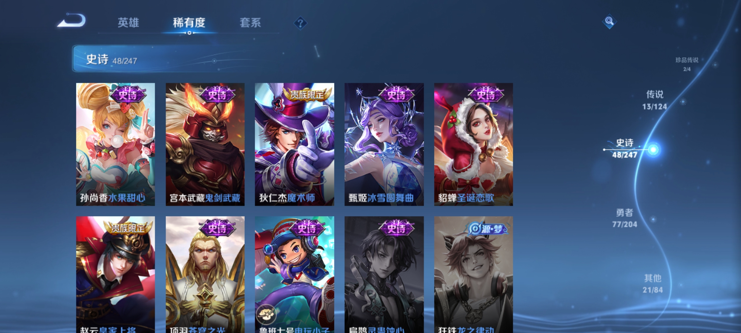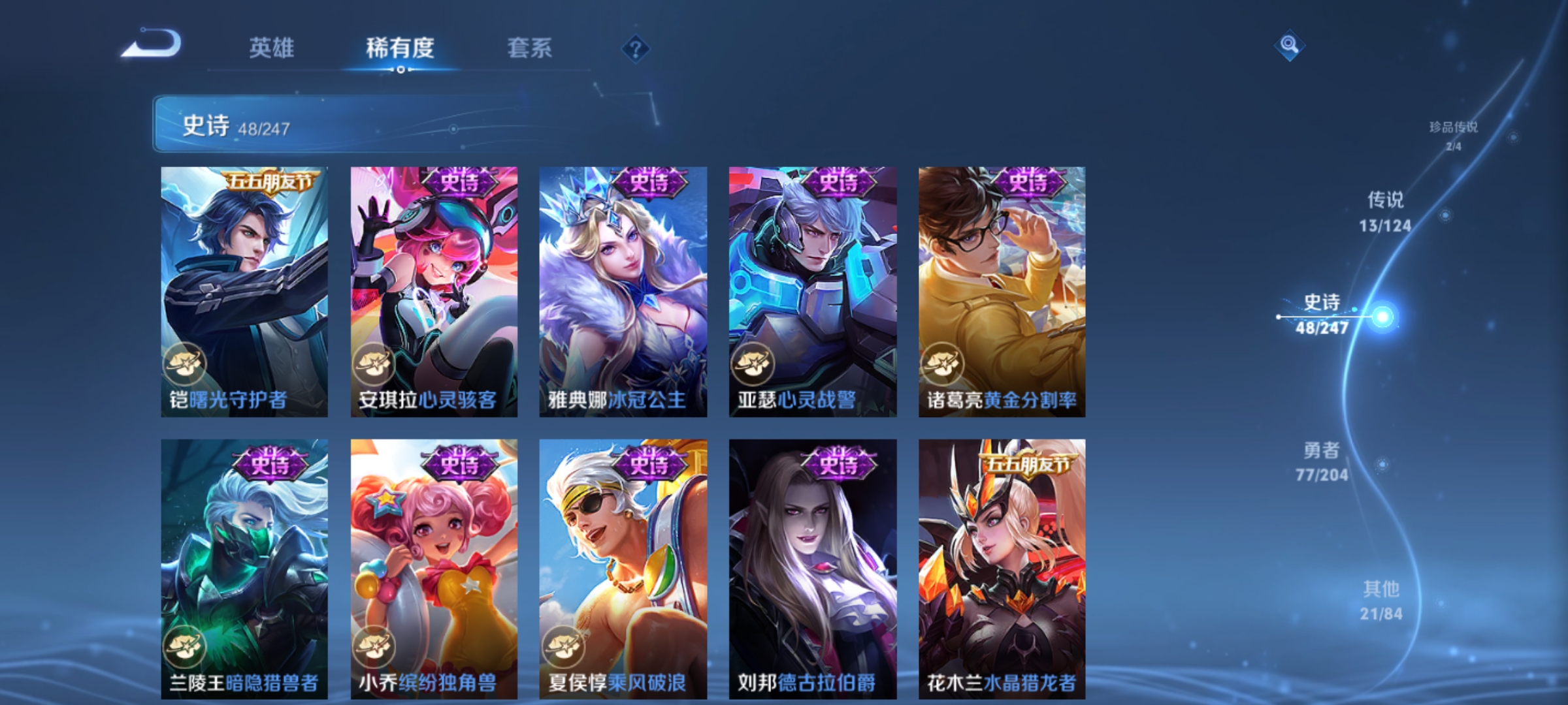 小乔青蛇,娜可露露晚萤,伽罗箭羽风息,诸葛亮黄金分割率,项羽苍穹之光,孙尚香时之恋人,雅典娜冰冠公主,吕布末日机甲,鲁班七号电玩小子,刘禅绅士熊喵,刘禅天才门将,安琪拉心灵骇客,安琪拉时之奇旅,刘邦德古拉伯爵,兰陵王暗隐猎兽者,曹操幽灵船长,宫本武藏鬼剑武藏,亚瑟心灵战警,蔡文姬舞动绿茵,小乔缤纷独角兽,夏侯惇乘风破浪,花木兰水晶猎龙者,铠曙光守护者,墨子金属风暴,吕布圣诞狂欢,貂蝉圣诞恋歌,嬴政暗夜贵公子,雅典娜黎明之约,李白千年之狐,刘禅电玩·爆裂旋风,李元芳匿光侦查者,高渐离燃音魔法