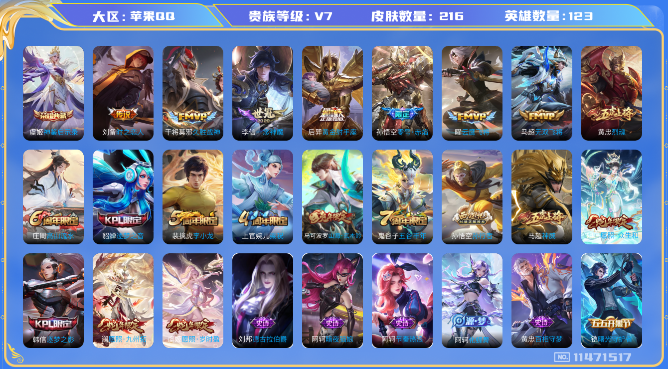 [11471517]V7 1典藏 10传说 123英雄 216皮肤 可修改实名 优质装备:神鉴启示录,黄金射手座,云鹰飞将(小将军),久胜战神,一念神魔,零号·赤焰,时之恋人-刘备(电焊工),无双飞将 珍宝阁皮:胡桃夹子,女武神 限定皮:愿照·九州拓(澜年限),愿照·岁时盈(虞姬年限),愿照·众生和(妲己年限),神威(电光马子),高山流水,五谷丰年,梁祝,烈魂,逐梦之音,李小龙,逐梦之影,孙行者,山海·玄木吟(马可年限) 史诗皮:鸭鸭历险记-刘禅,化蝶舞,龙之律动,雪豹·霜爪,石田雨龙,茶境仙,百相守梦-百里守约,百相守梦-黄忠,紫霞仙子,白龙吟,黄金分割率,特工魅影,千年之狐,电玩·爆裂旋风,蒙恬荣光圣徽,偶像歌手,龙骑士(小龙虾),暗夜猫娘,晚萤,青蛇,末日机甲-吕布,猫狗日记-孙策,时之恋人-孙尚香,节奏热浪,修罗,女仆咖啡,水果甜心,星夜王子,心灵骇客,时之奇旅-安琪拉,德古拉伯爵,暗隐猎兽者,鬼剑武藏,心灵战警,乐园奇幻夜,地狱岩魂,缤纷独角兽,曙光守护者,热力回旋,金属风暴,圣诞狂欢,圣诞恋歌,鹰眼统帅,魅力维加斯,黎明之约,无心