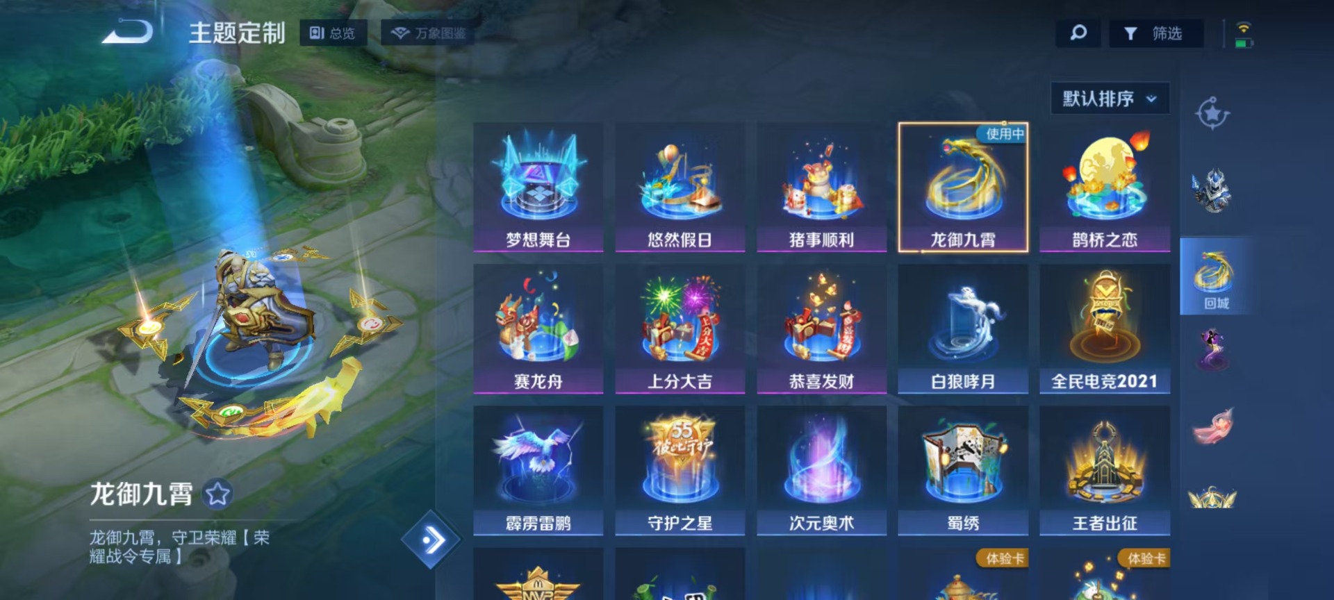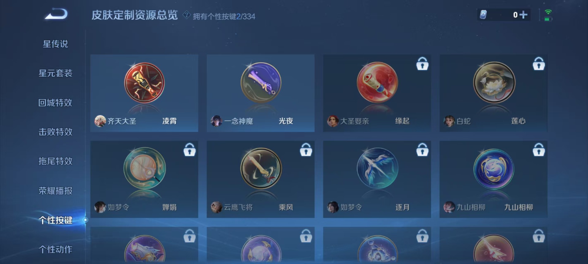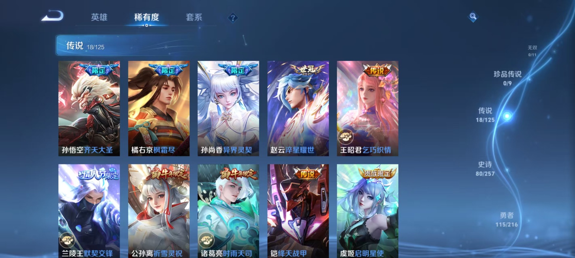 甄姬女儿国国王,铠青龙志,廉颇寅虎·御盾,伽罗太华,赵云百木心枪,孙尚香异界灵契,牛魔奔雷神使,吕布御风骁将,诸葛亮时雨天司,兰陵王默契交锋,公孙离祈雪灵祝,裴擒虎李小龙,上官婉儿梁祝,马可波罗山海·玄木吟,猪八戒猪悟能,孙悟空孙行者,芈月白晶晶,韩信傲雪梅枪,韩信飞衡,虞姬霸王别姬,关羽冰锋战神,橘右京枫霜尽