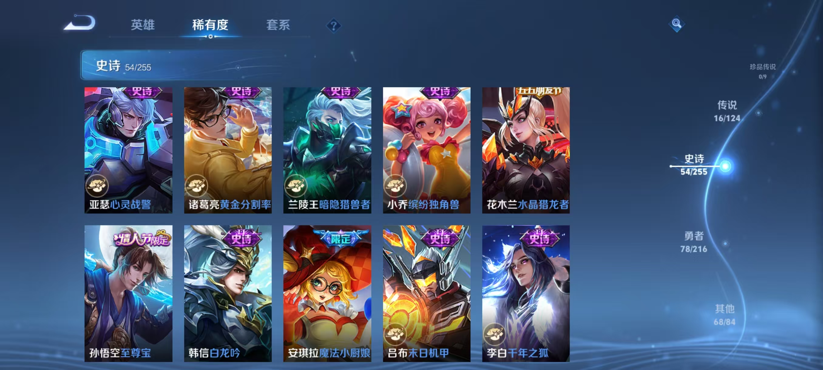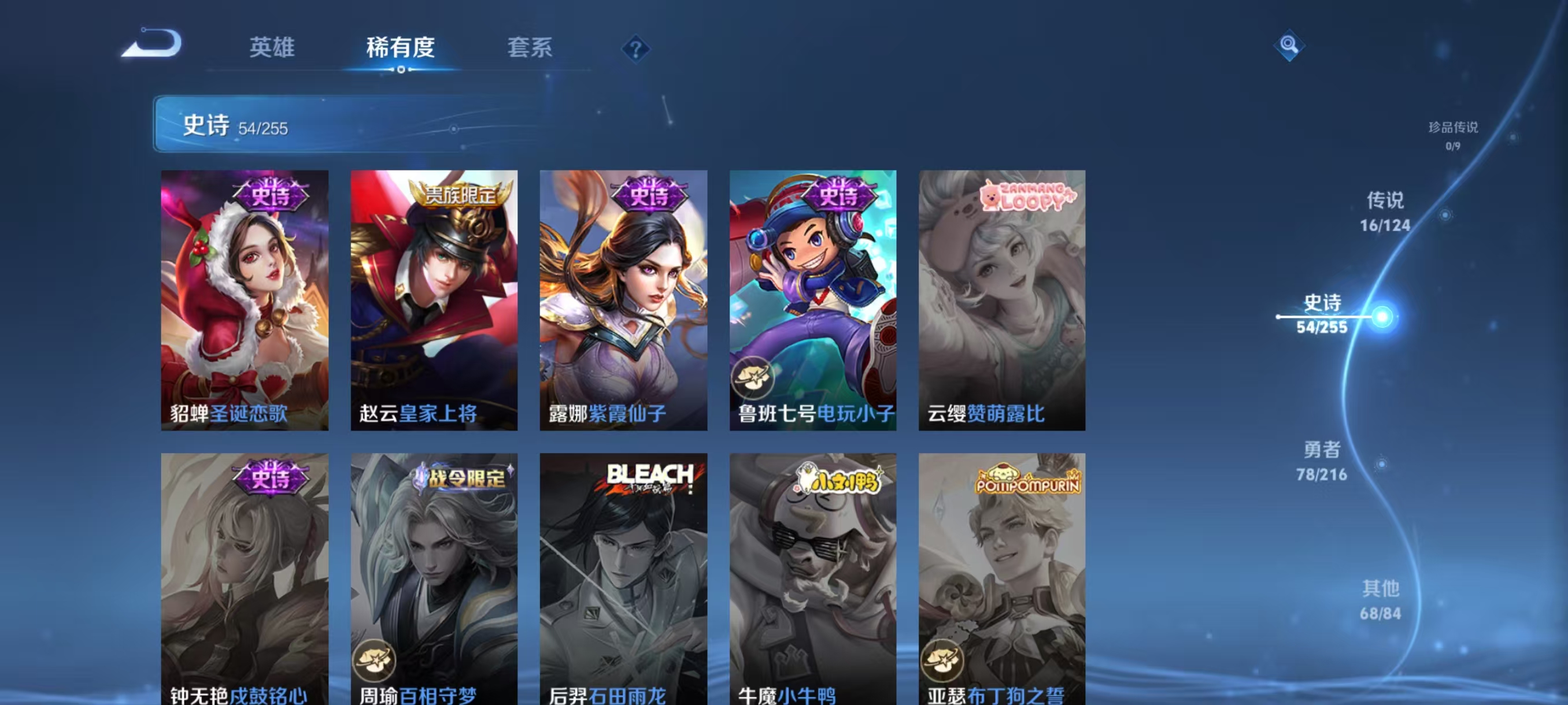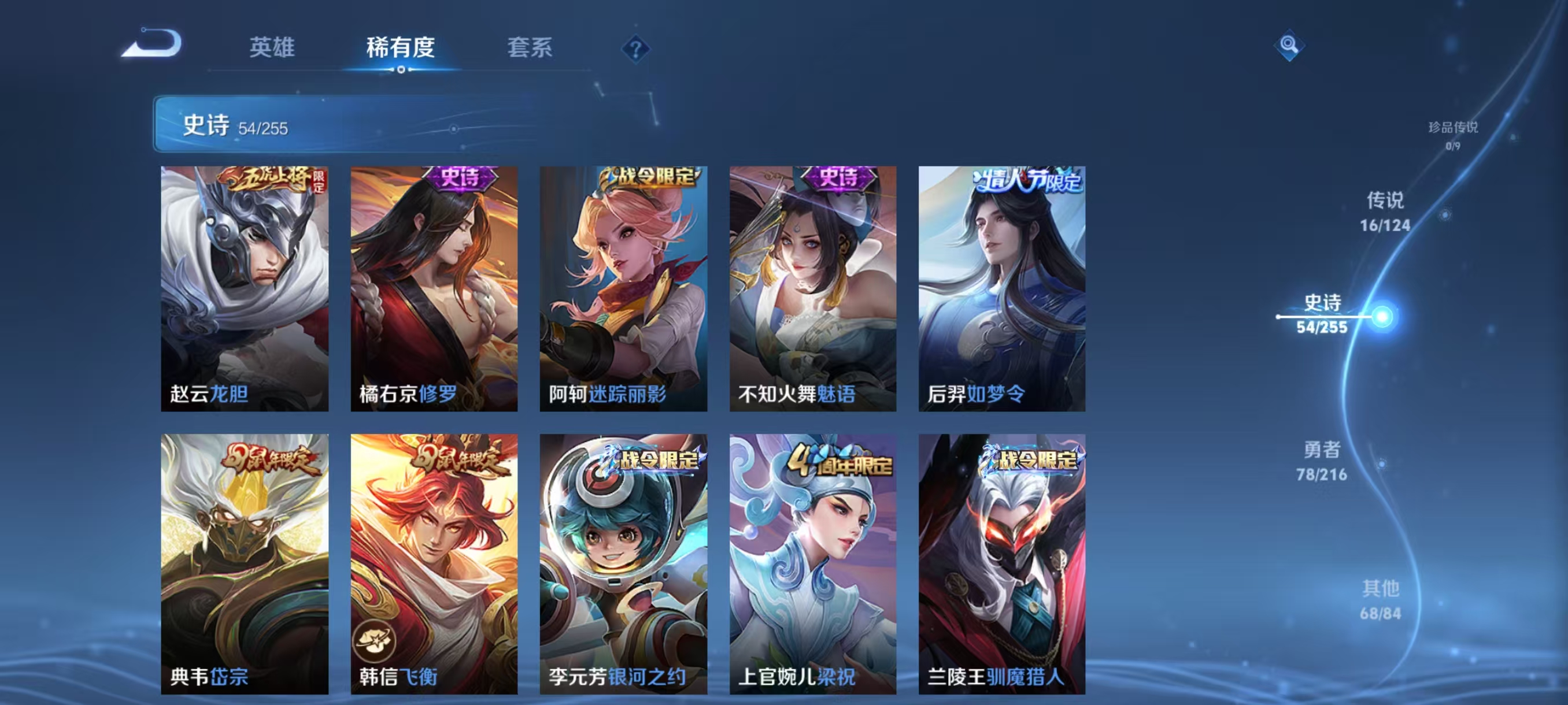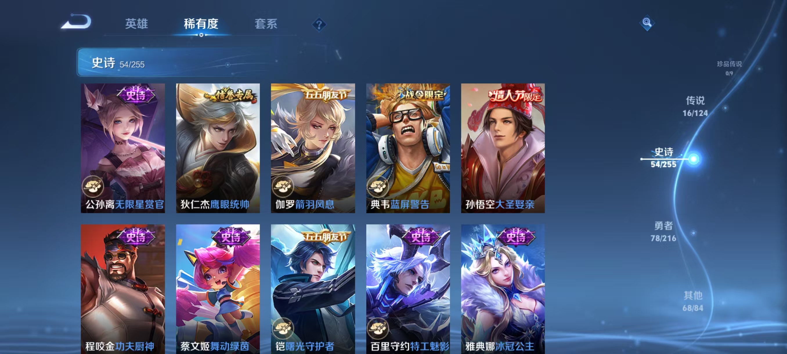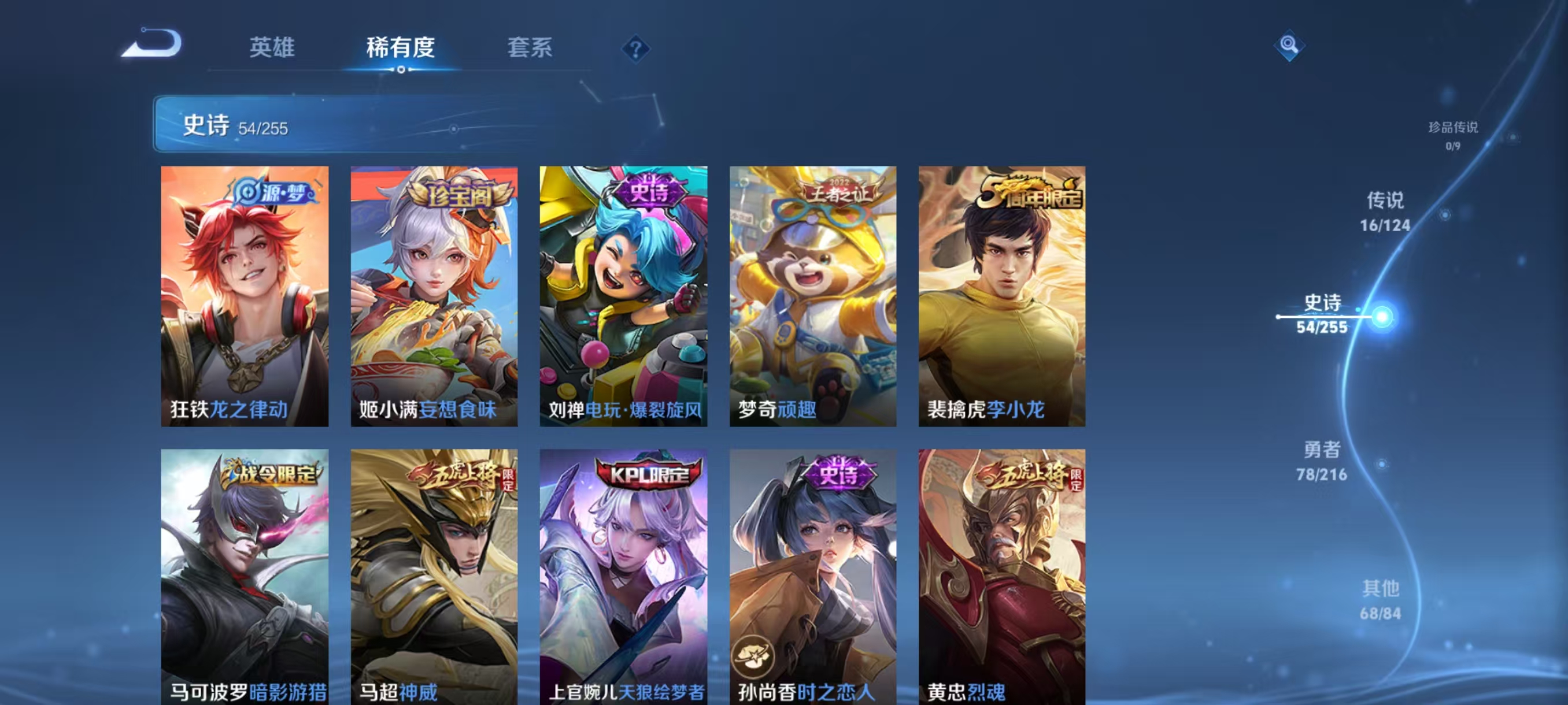 裴擒虎李小龙,上官婉儿梁祝,赵云龙胆,黄忠烈魂,马超神威,典韦岱宗,韩信飞衡,伽罗太华,上官婉儿天狼绘梦者,孙悟空大圣娶亲,后羿如梦令,孙悟空至尊宝,安琪拉魔法小厨娘,桑启鸣野蒿