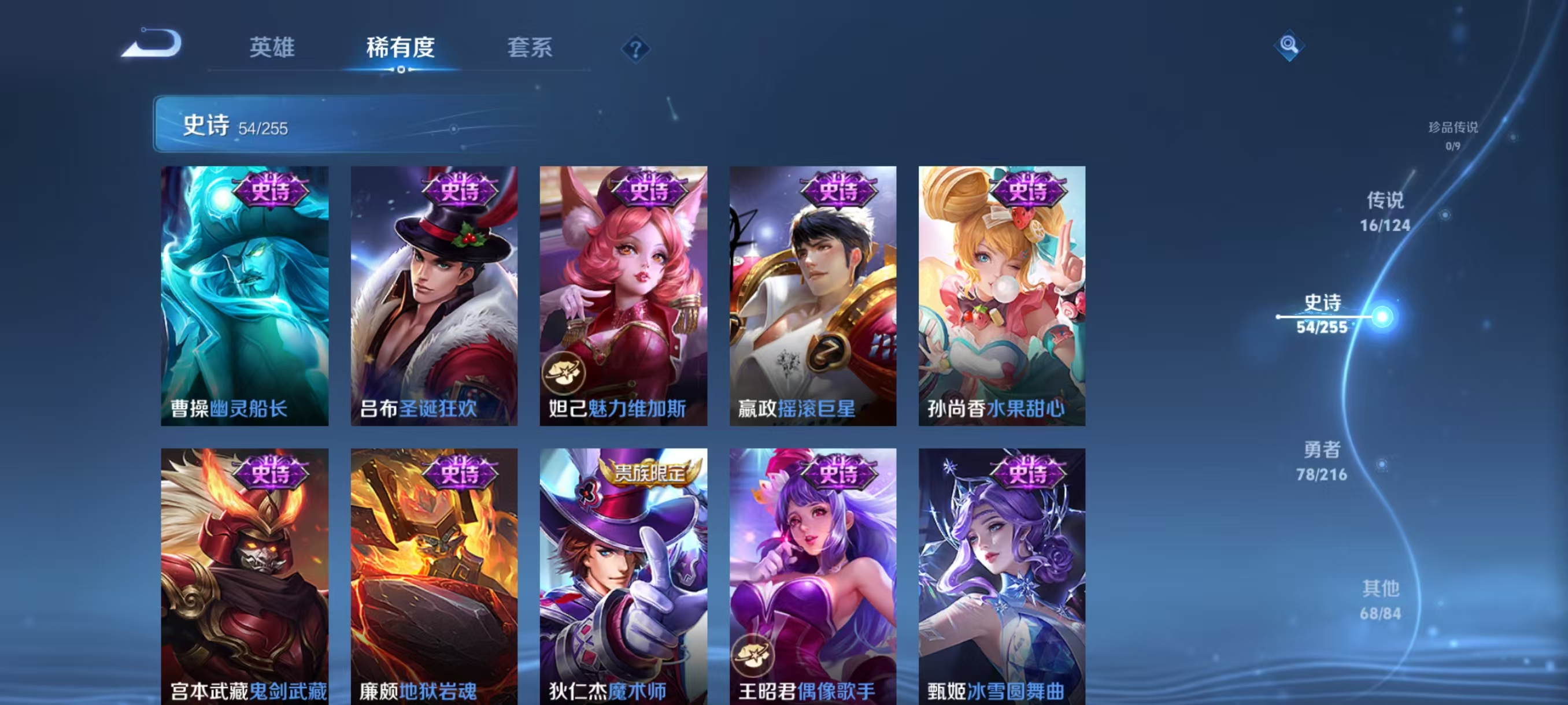 伽罗箭羽风息,不知火舞魅语,公孙离无限星赏官,露娜紫霞仙子,诸葛亮黄金分割率,王昭君偶像歌手,韩信白龙吟,孙尚香时之恋人,雅典娜冰冠公主,吕布末日机甲,鲁班七号电玩小子,橘右京修罗,嬴政摇滚巨星,程咬金功夫厨神,兰陵王暗隐猎兽者,曹操幽灵船长,宫本武藏鬼剑武藏,亚瑟心灵战警,蔡文姬舞动绿茵,廉颇地狱岩魂,小乔缤纷独角兽,花木兰水晶猎龙者,铠曙光守护者,吕布圣诞狂欢,貂蝉圣诞恋歌,百里守约特工魅影,李白千年之狐,刘禅电玩·爆裂旋风