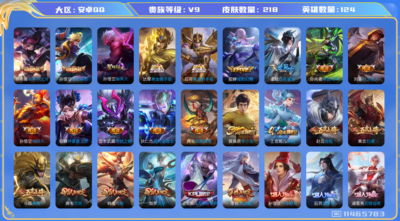- [11522888]V8 1典藏 1无双 11传说 125英雄 272皮肤 可修改实名 安全保护中 荣耀水晶:鸣剑·曳影 无双皮:离恨烟(公孙离无双) 传说皮:乘龙·问璇玑(孙尚香年限),淬星耀世,云鹰飞将(小将军),飞鸢探春,绛天战甲(鸡嘴战神),超时空战士-狄仁杰,记忆之芯(机甲兔),澜逐花归海 珍宝阁皮:妄想食味,女武神 限定皮:逐霄战戟,鸣野蒿,至尊宝,神威(电光马子),遇见飞天,高山流水,诗剑行,朱雀志(守约年限),孙行者,玉兔公主,山海·玄木吟(马可年限) 史诗皮:器灵·浮梦炉,撼地雄心,谪仙醉月,龙之律动,百相守梦-百里守约,战舞者,蒙犽顽岩魄,芈月浮光幕影,怒海争锋,海诺心动手记,决胜骁骑,蔬乡物语(鲁班七号),琥珀纪元伽罗,破空之剑,紫霞仙子,电玩小子(小书包),白龙吟,黄金分割率,特工魅影,永昼,末日机甲-莱西奥,江河有灵,高渐离燃音魔法,雪夜绮愿(周瑜),百解令(蒙犽),冰冠公主,青蛇,偶像歌手,晚萤,无限星赏官,末日机甲-吕布,猫狗日记-孙策,乱世虎臣,节奏热浪,修罗,摇滚巨星,水果甜心,天才门将,星夜王子,心灵骇客,功夫厨神,德古拉伯爵,暗隐猎兽者,幽灵船长,鬼剑武藏,天秀·启明,地狱岩魂,纤云弄巧,拒霜思,月团寄思,水晶猎龙者,曙光守护者,金属风暴,原初追逐者,圣诞狂欢,圣诞恋歌,鹰眼统帅,暗夜贵公子,魅力维加斯,黎明之约,无心,未来纪元-赵云