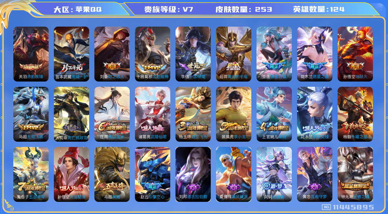 [11445895]V7 1典藏 1珍品传说 11传说 124英雄 253皮肤 可修改实名 优质装备:赤影疾锋,黑崎一护,黄金射手座,久胜战神,一念神魔,地狱火,时之恋人-刘备(电焊工),无双飞将,燃星之曲 传说皮:死亡执政官,落雪白狼 珍宝阁皮:蔷薇恋人,玩趣恶龙 限定皮:武陵仙君(小桃花),神威(电光马子),遇见飞天,高山流水,五谷丰年,梁祝,李小龙,永曜之星,默契交锋-花木兰,大圣娶亲,引擎之心 史诗皮:赞萌露比,鸭鸭历险记-刘禅,化蝶舞,龙之律动,石田雨龙,百相守梦-周瑜,百相守梦-黄忠,紫霞仙子,苍穹之光,特工魅影,千年之狐,永昼,魅语,无限星赏官,冰冠公主,猫狗日记-孙策,修罗,女仆咖啡,摇滚巨星,水果甜心,星夜王子,心灵骇客,功夫厨神,德古拉伯爵,暗隐猎兽者,幽灵船长,鬼剑武藏,心灵战警,乐园奇幻夜,地狱岩魂,纤云弄巧,繁星吟游(呼啦呼啦),缤纷独角兽,乘风破浪,逐浪之夏,水晶猎龙者,金属风暴,原初追逐者,圣诞狂欢,圣诞恋歌,鹰眼统帅,王者之锤,黎明之约,奇遇舞章,无心,未来纪元-赵云