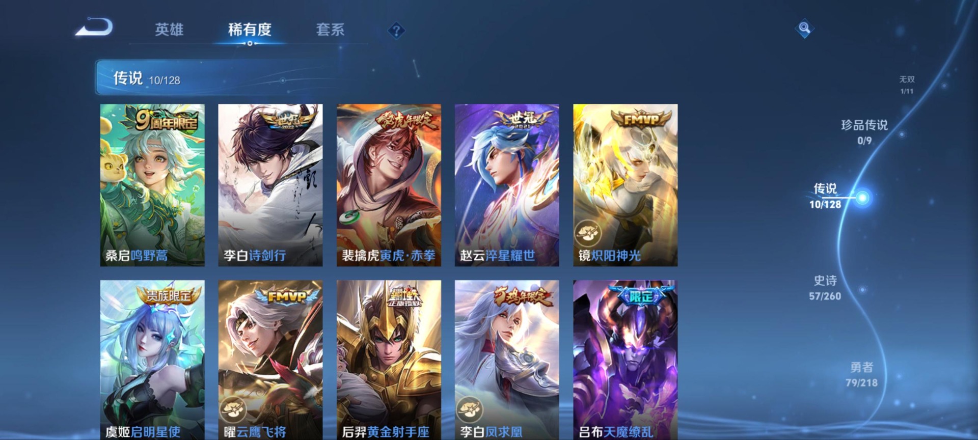 - [11526554]V8 13传说 121英雄 153皮肤 可修改实名 优质装备:黄金狮子座,黄金射手座,冠军飞将,云鹰飞将(小将军),炽阳神光,一念神魔,末日机甲-孙尚香(绿蚂蚱),李逍遥,乞巧织情,淬星耀世,超时空战士-狄仁杰 珍宝阁皮:玩趣恶龙 限定皮:白虎志(电光耗子),傲雪梅枪,时雨天司(水龙头),高山流水,五谷丰年,青龙志(铠年限),李小龙,大圣娶亲,青春决赛季 史诗皮:紫霞仙子,苍穹之光,白龙吟,特工魅影,魅语,无限星赏官,晚萤,龙骑士(小龙虾),时之恋人-孙尚香,乱世虎臣,修罗,水果甜心,天才门将,星夜王子,功夫厨神,暗隐猎兽者,幽灵船长,天秀·启明,纤云弄巧,繁星吟游(呼啦呼啦),乘风破浪,水晶猎龙者,曙光守护者,金属风暴,原初追逐者,圣诞狂欢,圣诞恋歌,鹰眼统帅,魅力维加斯,黎明之约,无心,未来纪元-赵云1