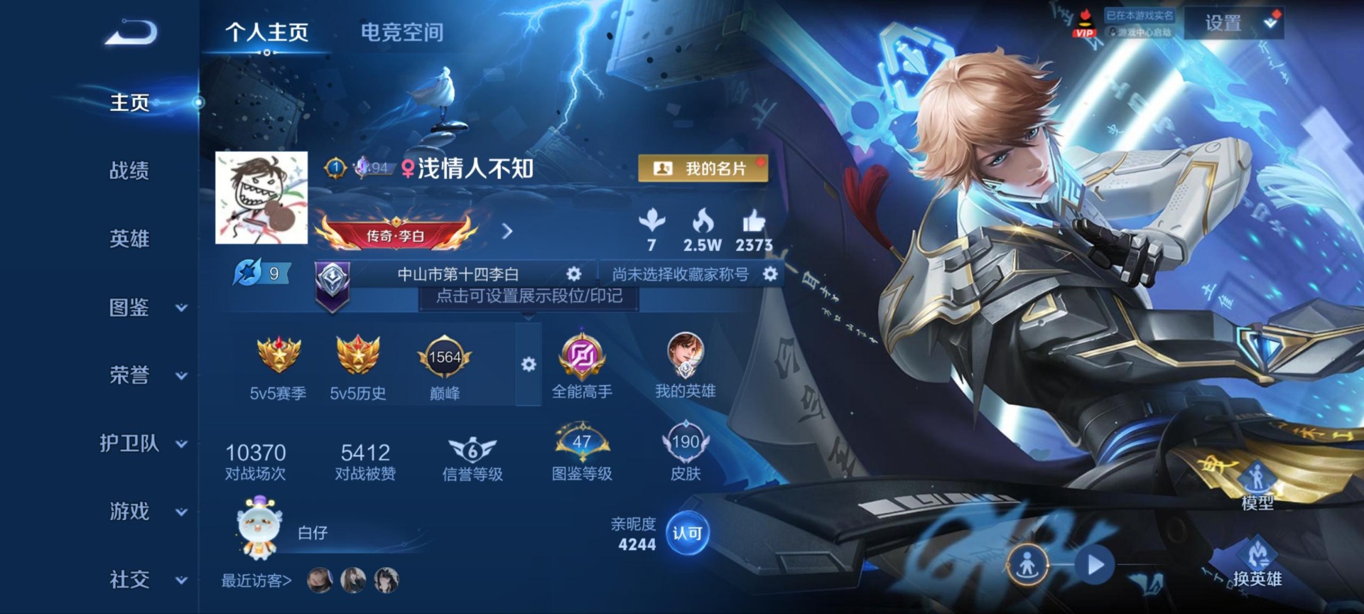 - PX_2093858-实名: 可修改 贵族等级: V7 英雄数: 104 皮肤数: 101 荣耀水晶: 最初的交响 无双皮: 雪境奇遇-甄姬 珍品传说: 江户川柯南,怪盗基德 传说皮: 绛天战甲,幻光神枪 限定皮: 引擎之心,鸣野蒿,愿照·山河定