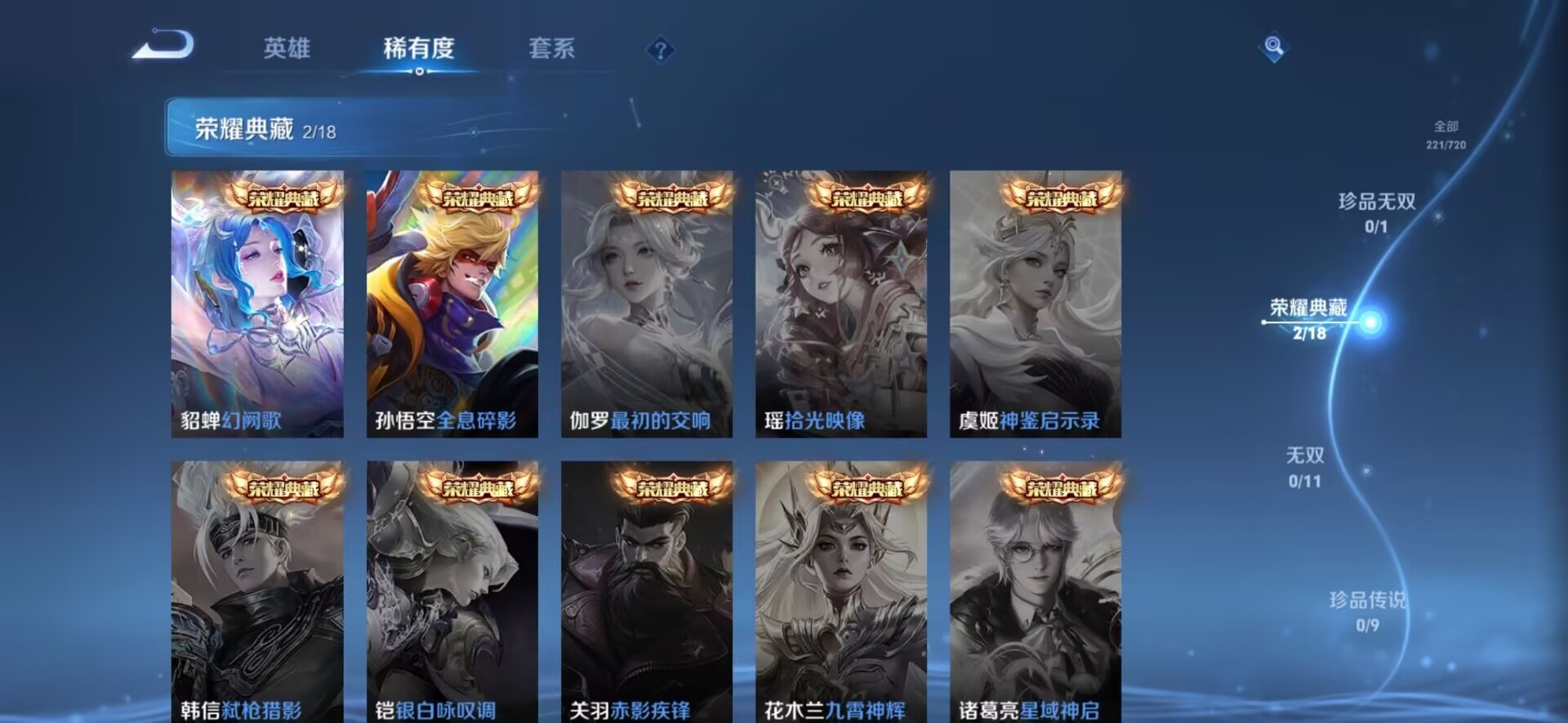 高渐离燃音魔法,阿轲节奏热浪,曹操幽灵船长,伽罗箭羽风息,廉颇地狱岩魂,孙策猫狗日记,吕布圣诞狂欢,露娜紫霞仙子,吕布末日机甲,宫本武藏鬼剑武藏,兰陵王暗隐猎兽者,貂蝉圣诞恋歌,貂蝉唤灵魅影,花木兰水晶猎龙者,李白千年之狐,安琪拉心灵骇客,蒙犽百解令,杨戬天秀·启明,亚瑟心灵战警,程咬金功夫厨神,雅典娜黎明之约,李元芳逐浪之夏,墨子金属风暴,嫦娥拒霜思,钟馗乐园奇幻夜