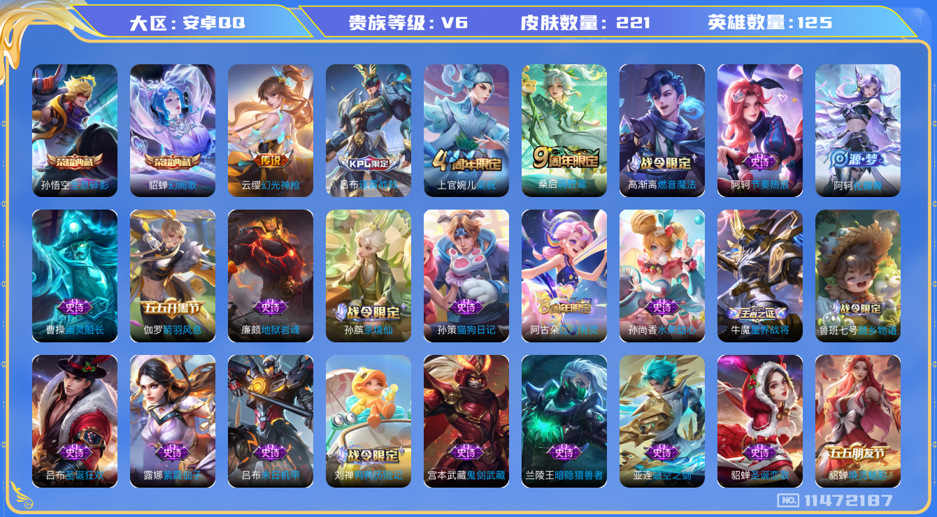 [11472187]V6 2典藏 2传说 125英雄 221皮肤 可修改实名 女号 荣耀水晶:幻阙歌(貂蝉典藏),全息碎影(猴子典藏) 传说皮:幻光神枪 珍宝阁皮:玩趣恶龙 限定皮:逐霄战戟,鸣野蒿,梁祝 史诗皮:星界战将,茶境仙,鸭鸭历险记-刘禅,龙之律动,百相守梦-百里守约,蒙犽顽岩魄,蔬乡物语(鲁班七号),化蝶舞,破空之剑,紫霞仙子,千年之狐,江河有灵,高渐离燃音魔法,百解令(蒙犽),末日机甲-吕布,猫狗日记-孙策,节奏热浪,女仆咖啡,水果甜心,心灵骇客,功夫厨神,暗隐猎兽者,幽灵船长,鬼剑武藏,心灵战警,乐园奇幻夜,天秀·启明,地狱岩魂,纤云弄巧,拒霜思,逐浪之夏,水晶猎龙者,箭羽风息,唤灵魅影,金属风暴,圣诞狂欢,圣诞恋歌,鹰眼统帅,魅力维加斯,黎明之约,未来纪元-赵云