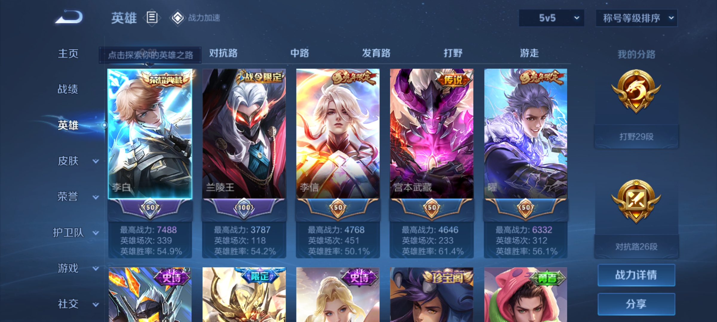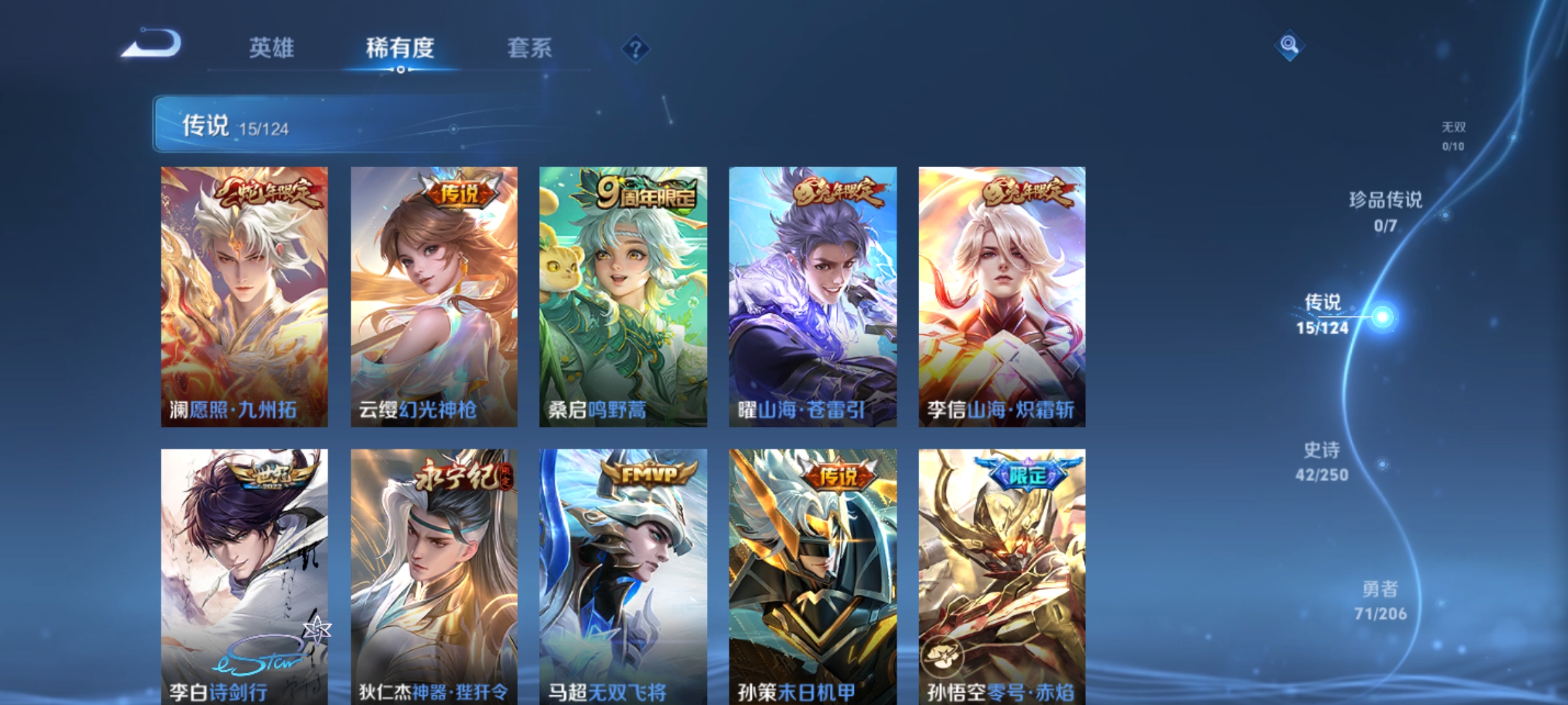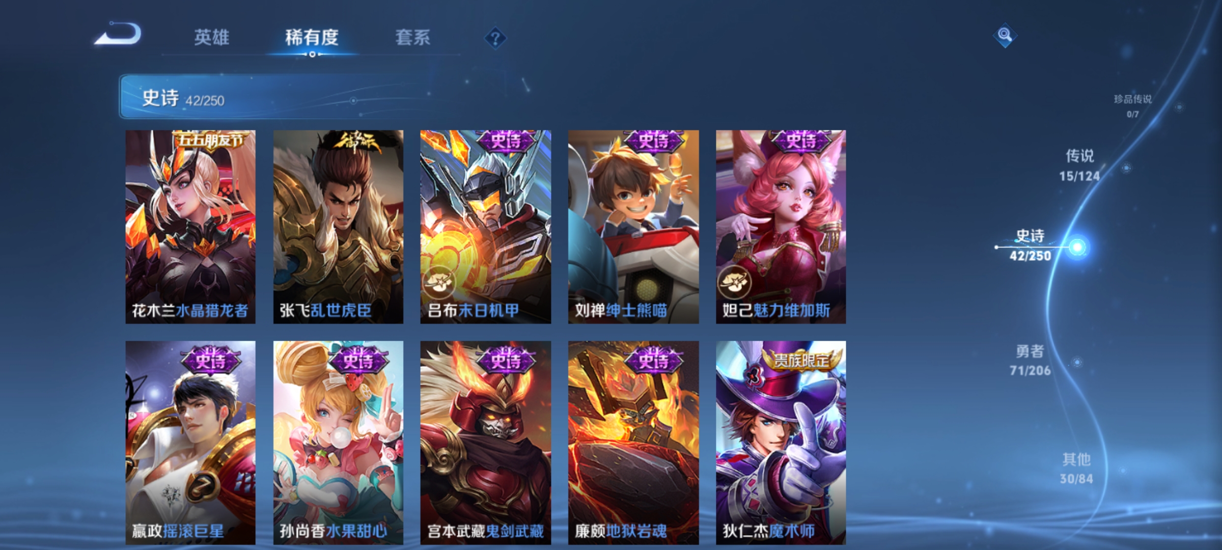 - PX_2097701-贵族等级: V5 英雄数: 79 皮肤数: 57 传说皮: 霜月吟,澜逐花归海,祥瑞亨通 限定皮: 鸣野蒿,逐霄战戟