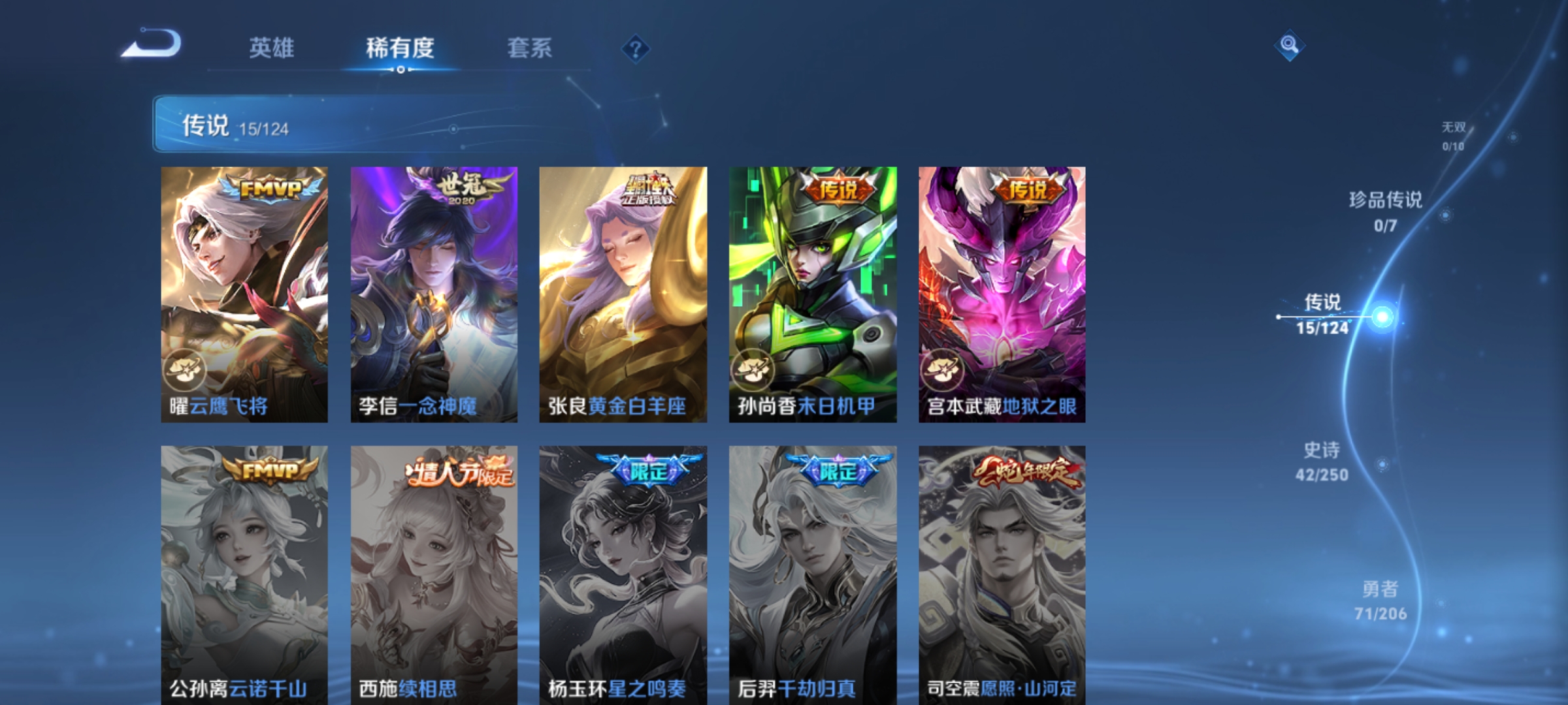 - [12146836]V7 1典藏 6传说 124英雄 194皮肤 可修改实名 优质装备:弑枪猎影(韩信典藏),久胜战神,一念神魔,地狱火,李逍遥,涂山容容 珍宝阁皮:胡桃夹子,女武神 限定皮:鸣野蒿,白鹤梁神女,白晶晶,诗剑行,五谷丰年,冰锋战神,梁祝,李小龙,大圣娶亲 史诗皮:化蝶舞,百相守梦-黄忠,紫霞仙子,白龙吟,黄金分割率,特工魅影,千年之狐,江河有灵,偶像歌手,晚萤,龙骑士(小龙虾),末日机甲-吕布,猫狗日记-孙策,乱世虎臣,修罗,女仆咖啡,水果甜心,星夜王子,功夫厨神,德古拉伯爵,暗隐猎兽者,鬼剑武藏,心灵战警,纤云弄巧,乘风破浪,唤灵魅影,金属风暴,鹰眼统帅,魅力维加斯