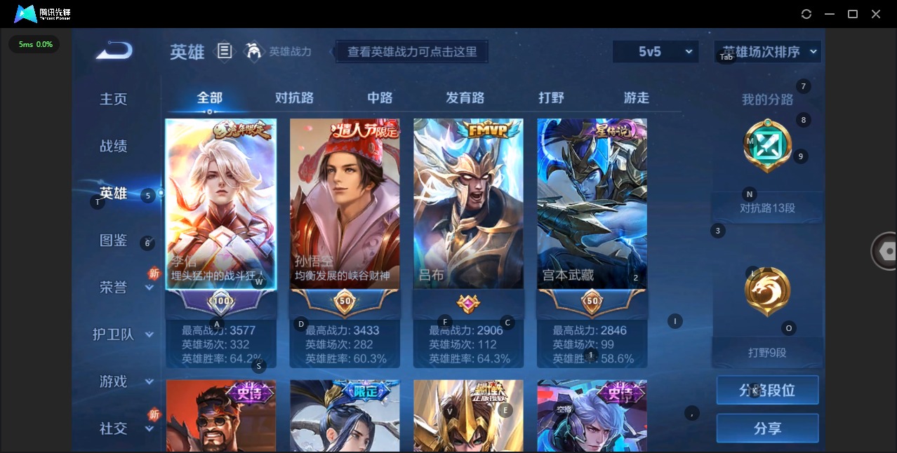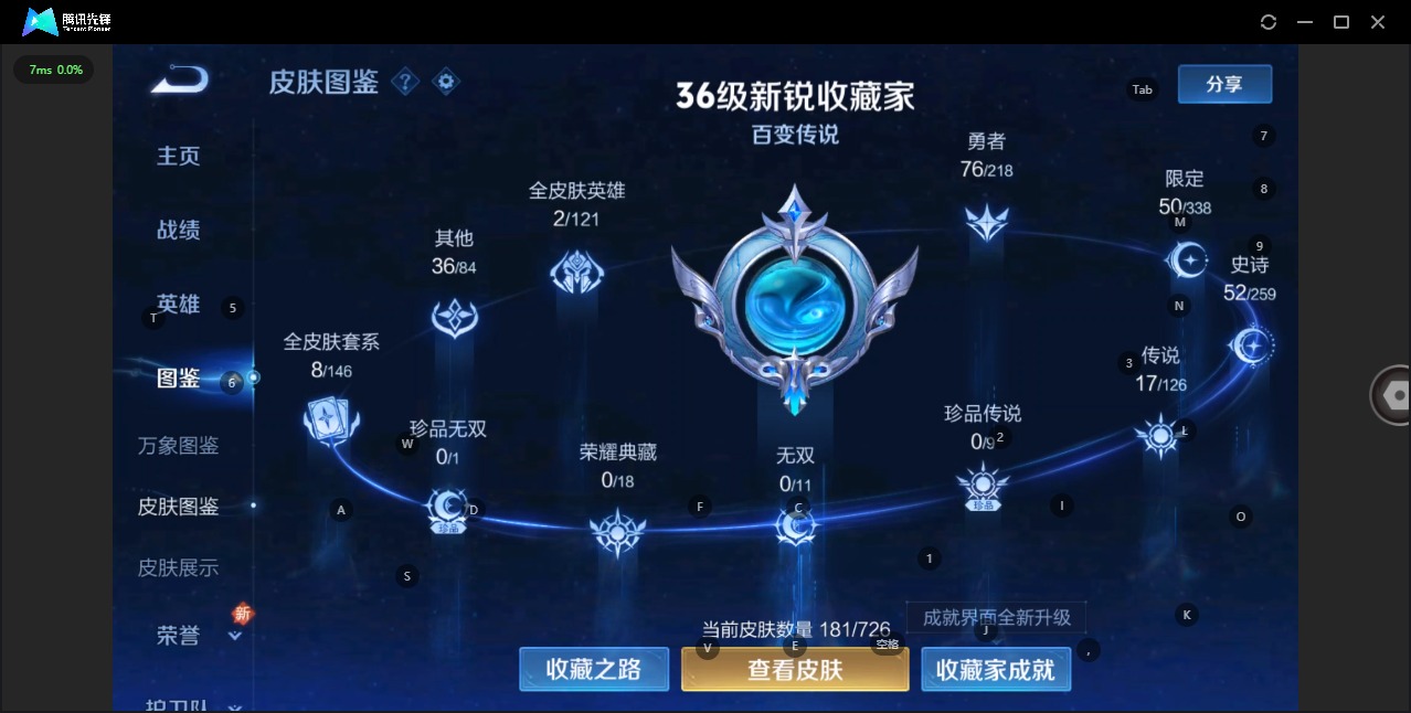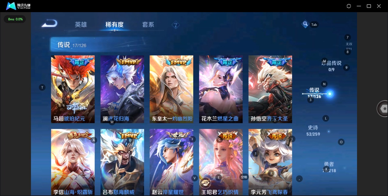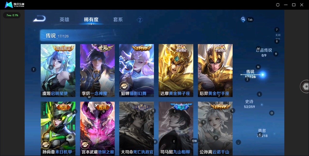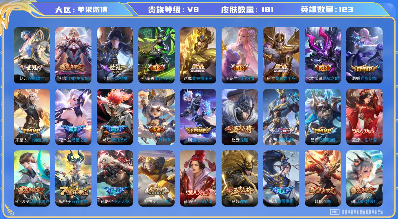 - PX_2102683-贵族等级: V5 英雄数: 122 皮肤数: 96 传说皮: 云鹰飞将,山海·苍雷引 限定皮: 五谷丰年