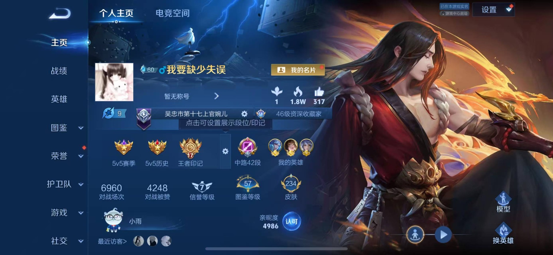 - [11913641]V8 1典藏 1珍品传说 11传说 125英雄 331皮肤 可修改实名 优质装备:银白咏叹调(倪克斯侍卫),黑崎一护,云鹰飞将(小将军),久胜战神,零号·赤焰,超时空战士-狄仁杰,浮生妄,鹤羽星尊 珍宝阁皮:女武神,玩趣恶龙 限定皮:至尊宝,白虎志(电光耗子),神威(电光马子),飞衡(韩信年限),降魔,五谷丰年,天狼运算者,游园惊梦,梁祝,逐梦之星,祈雪灵祝(雪兔子),李小龙,逐梦之影,永曜之星,辉光之辰,默契交锋-花木兰,猪悟能,大圣娶亲,引擎之心,青春决赛季,冰霜恋舞曲,寅虎·赤拳(老虎年限),时之祈愿-云中君,冰霜神祇 史诗皮:龙之律动,石田雨龙,琥珀纪元伽罗,遇见神鹿,紫霞仙子,苍穹之光,电玩小子(小书包),白龙吟,黄金分割率,特工魅影,千年之狐,江河有灵,百解令(蒙犽),高渐离燃音魔法,匿光破解者,冰冠公主,偶像歌手,晚萤,电玩·爆裂旋风,暗夜猫娘,银翎春语,龙骑士(小龙虾),末日机甲-吕布,猫狗日记-孙策,猫狗日记-大乔,时之恋人-孙尚香,乱世虎臣,节奏热浪,女仆咖啡,摇滚巨星,水果甜心,绅士熊喵,天才门将,星夜王子,心灵骇客,功夫厨神,德古拉伯爵,暗隐猎兽者,幽灵船长,鬼剑武藏,心灵战警,舞动绿茵,地狱岩魂,纤云弄巧,繁星吟游(呼啦呼啦),拒霜思,缤纷独角兽,乘风破浪,逐浪之夏,水晶猎龙者,曙光守护者,箭羽风息,金属风暴,圣诞狂欢,圣诞恋歌,鹰眼统帅,暗夜贵公子,魅力维加斯,滕王阁序,无心,未来纪元-赵云,玫瑰异探