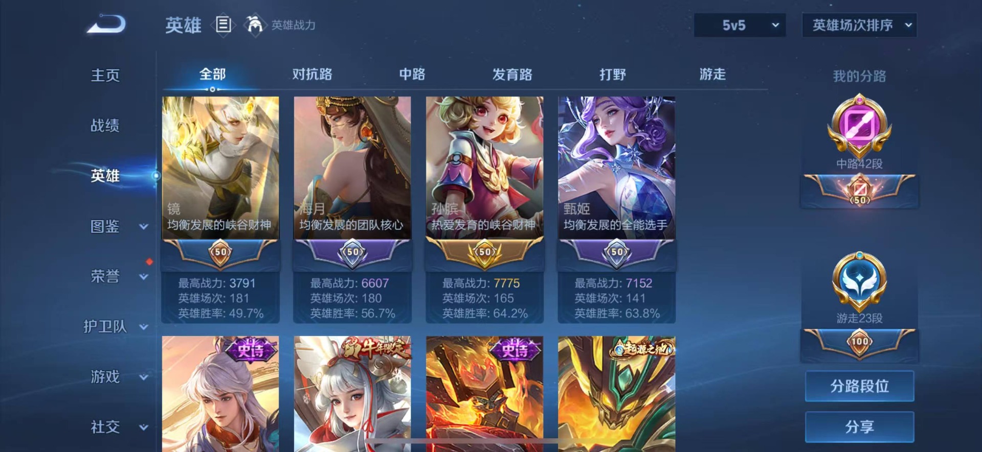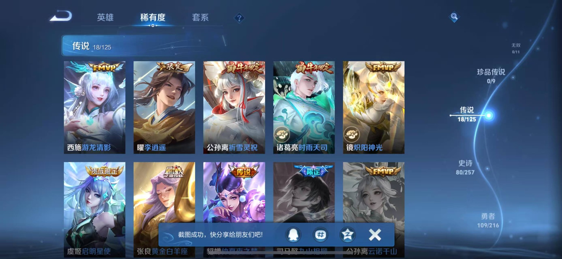 - [11521513]实名: 可修改 贵族等级: V6 英雄数: 123 皮肤数: 177 传说皮: 地狱火 限定皮: 冰锋战神,遇见飞天,李小龙,梁祝,飞衡,至尊宝,五谷丰年