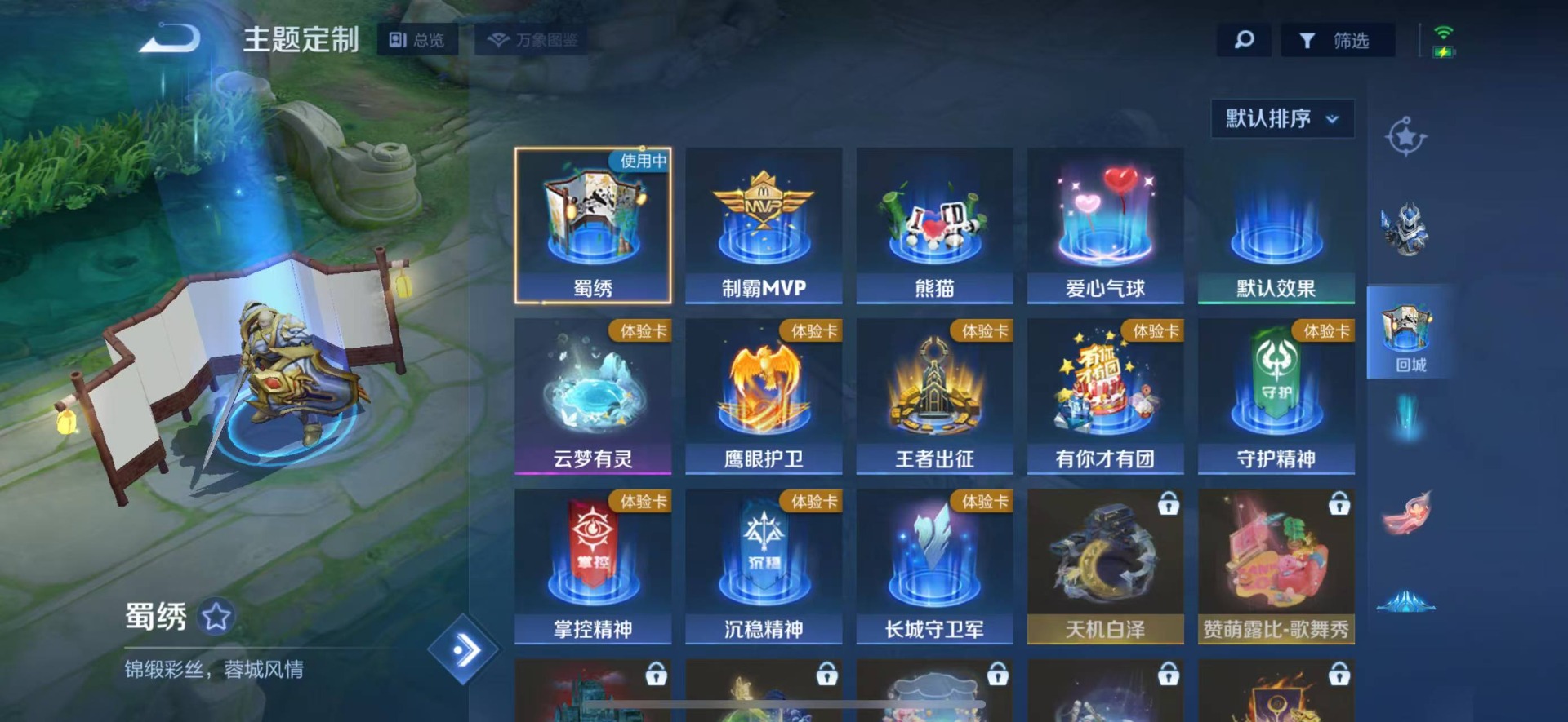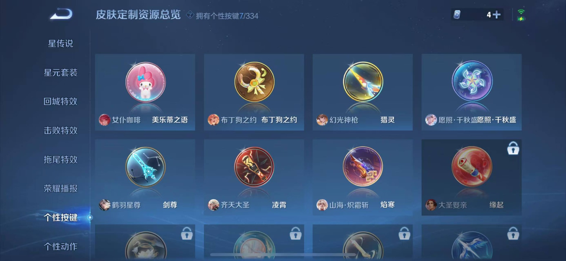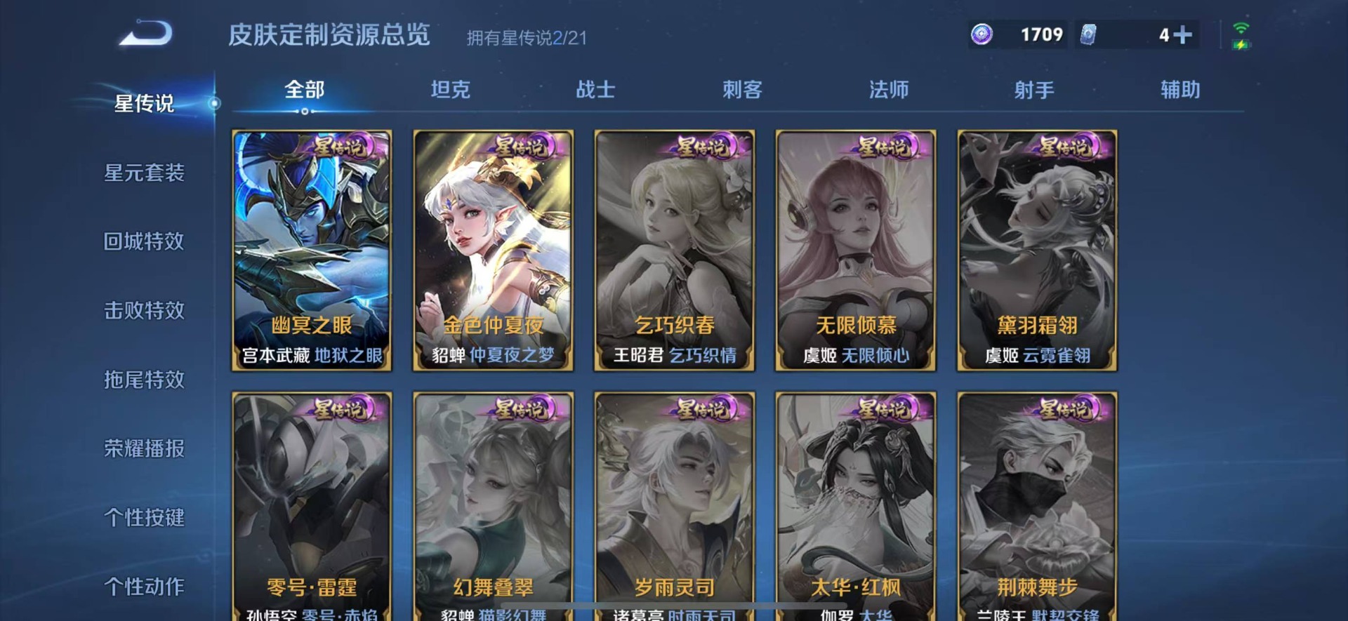 大乔白鹤梁神女,伽罗天狼溯光者,干将莫邪冰霜恋舞曲,孙尚香异界灵契,不知火舞绯月行,吕布御风骁将,露娜一生所爱,诸葛亮时雨天司,杨玉环寅虎·心曲,公孙离祈雪灵祝,裴擒虎李小龙,上官婉儿梁祝,上官婉儿神器·万象笔,上官婉儿天狼绘梦者,桑启鸣野蒿,女娲愿照·千秋盛,芈月白晶晶,马超神威,百里守约朱雀志,关羽冰锋战神