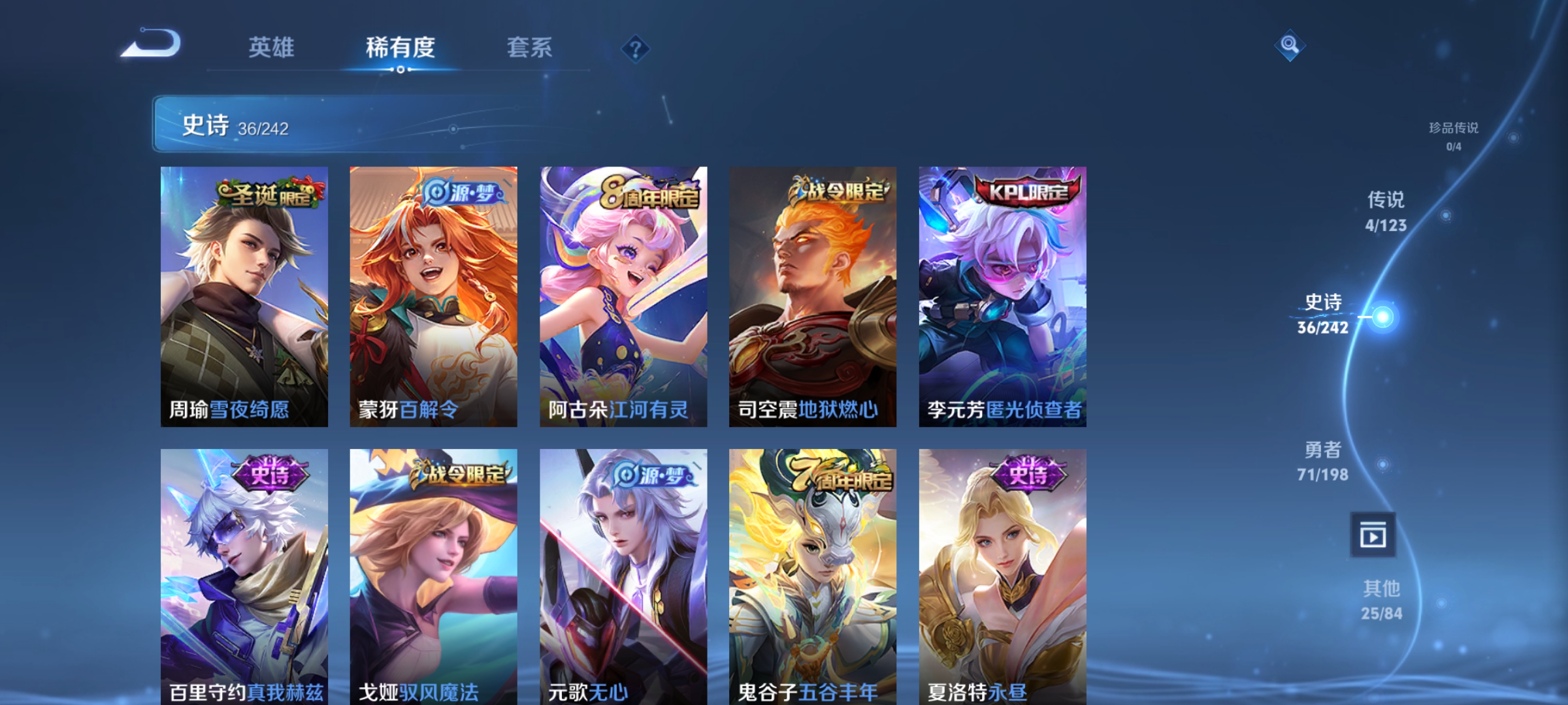 芈月重明,典韦穷奇,狂铁御狮,米莱狄御霄,牛魔御旌,盾山御銮,夏侯惇朔风刀,明世隐疑决卦,老夫子醍醐杖,鬼谷子原初探秘者,程咬金演武夺筹,钟馗驱傩正仪,兰陵王金庭之子,沈梦溪大漠名商,李元芳云中旅人,桑启海盐诗旅,裴擒虎擒涛扼浪,鲁班大师探海日志,张良古海寻踪