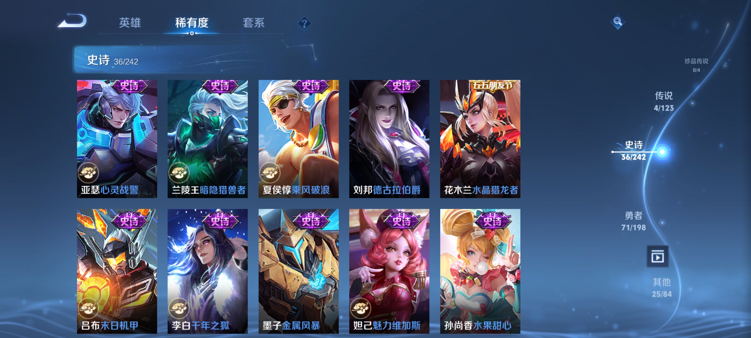 - [11713857]V8 1典藏 1珍品传说 11传说 124英雄 169皮肤 可修改实名 优质装备:弑枪猎影(韩信典藏),黑崎一护,云鹰飞将(小将军),久胜战神,一念神魔,末日机甲-孙尚香(绿蚂蚱),胖达荣荣 珍宝阁皮:玩趣恶龙 限定皮:至尊宝,白虎志(电光耗子),凤求凰(白切鸡),太华(伽罗年限),时之彼端,时雨天司(水龙头),梁祝,龙胆,岱宗(典韦年限),虎魄,天狼征服者,李小龙,辉光之辰,天魔缭乱 史诗皮:鸭鸭历险记-刘禅,龙之律动,紫霞仙子,黄金分割率,特工魅影,千年之狐,魅语,无限星赏官,冰冠公主,晚萤,龙骑士(小龙虾),猫狗日记-孙策,时之恋人-孙尚香,乱世虎臣,节奏热浪,修罗,摇滚巨星,水果甜心,星夜王子,心灵骇客,暗隐猎兽者,心灵战警,乐园奇幻夜,舞动绿茵,地狱岩魂,纤云弄巧,繁星吟游(呼啦呼啦),缤纷独角兽,乘风破浪,逐浪之夏,水晶猎龙者,曙光守护者,金属风暴,圣诞恋歌,鹰眼统帅,魅力维加斯