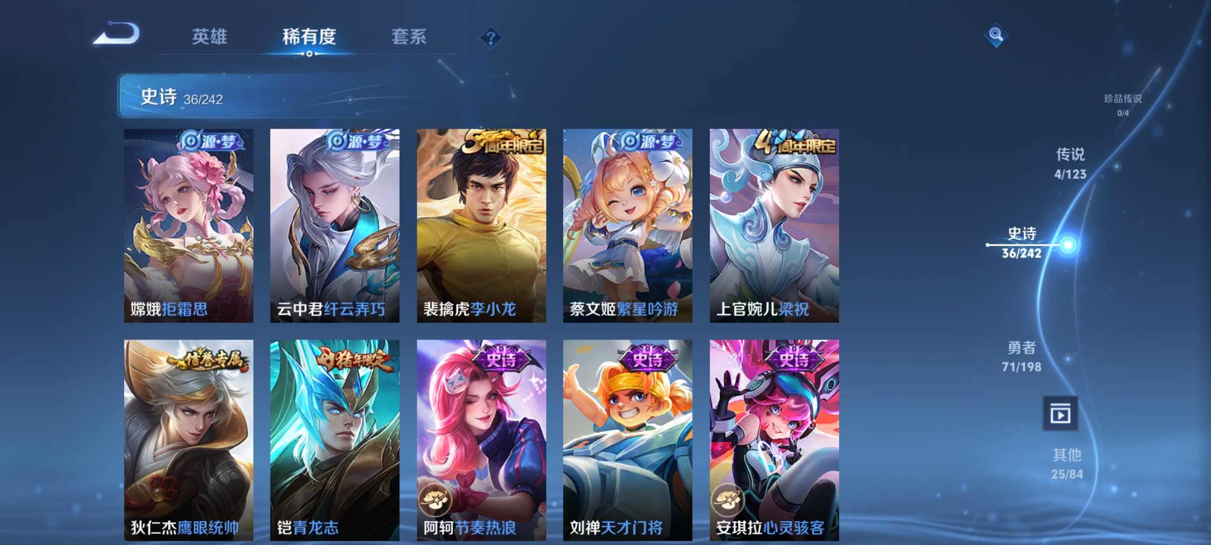 - PX_2094856-安卓Q 【可二次】 英雄数量:125 皮肤数量:237 贵族等级:贵族V8 荣耀典藏1 珍品传说1 传说品质14 史诗品质59鸣剑曳影 怪盗基德 凤求凰 音你闪耀 猫影幻舞 太华 无双飞将 玄雷天君 寅虎赤拳 愿照·山河定 炽阳神光 启明星使 惊梅引 地狱火 黄金白羊座 云诺千山 至尊宝 心灵战警 狮舞东方 白昼王子 鬼剑武藏 魅力维加斯 皇家上将 暗隐猎兽者 德古拉伯爵 幽