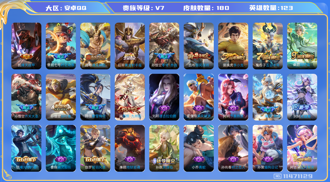 [11471129]V7 8传说 123英雄 180皮肤 可修改实名 优质装备:黄金射手座,绛天战甲(鸡嘴战神),零号·赤焰,遇见神鼓,鲁班七号-时之奇旅 珍宝阁皮:妄想食味,蔷薇恋人 限定皮:愿照·九州拓(澜年限),鸣野蒿,傲雪梅枪,齐天大圣,五谷丰年,御风骁将(吕布年限),李小龙,孙行者 史诗皮:鸭鸭历险记-刘禅,糖绘人间,狼魂孤将,绮世丹青,化蝶舞,龙之律动,雪豹·霜爪,藏狐·褐绒,茶境仙,东方月初,芈月浮光幕影,百相守梦-百里守约,星界特工,特工魅影,永昼,江河有灵,真我赫兹(百里守约),青蛇,偶像歌手,末日机甲-吕布,猫狗日记-孙策,时之恋人-孙尚香,节奏热浪,修罗,女仆咖啡,摇滚巨星,水果甜心,绅士熊喵,天才门将,心灵骇客,功夫厨神,德古拉伯爵,暗隐猎兽者,幽灵船长,鬼剑武藏,天秀·启明,舞动绿茵,地狱岩魂,纤云弄巧,乘风破浪,逐浪之夏,曙光守护者,箭羽风息,金属风暴,圣诞狂欢,鹰眼统帅,未来纪元-赵云