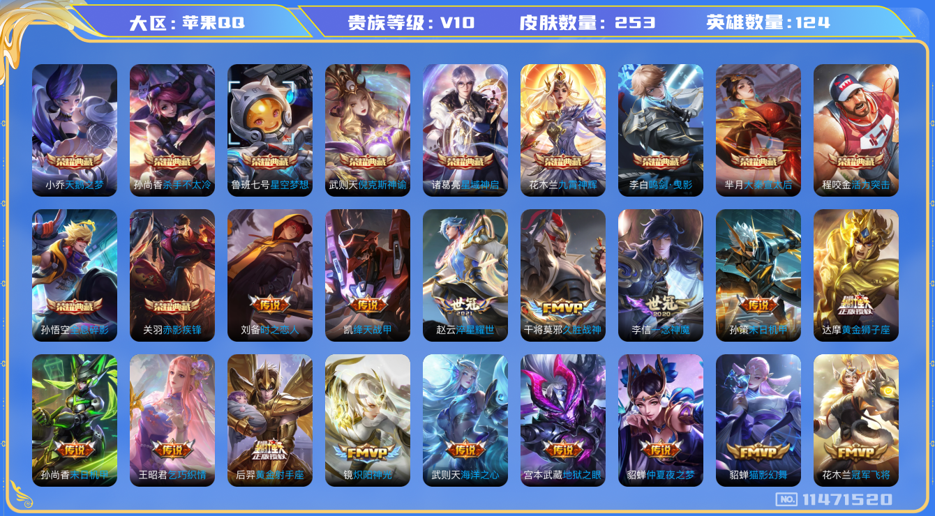 [11471520]V10 11典藏 37传说 124英雄 253皮肤 典藏英雄武则天 可修改实名 优质装备:天鹅之梦(小乔典藏),星空梦想(太空人),倪克斯神谕(宇宙婆娘),活力突击,杀手不太冷,大秦宣太后,鸣剑·曳影,全息碎影(猴子典藏),星域神启(倪克斯贼亮),九霄神辉(木兰典藏),赤影疾锋,黄金狮子座,黄金射手座,冠军飞将,云鹰飞将(小将军),绛天战甲(鸡嘴战神),黄金白羊座,猫影幻舞,久胜战神,炽阳神光,一念神魔,云霓雀翎,末日机甲-孙尚香(绿蚂蚱),仲夏夜之梦(大飞蛾),零号·赤焰,海洋之心,地狱之眼,胖达荣荣,乞巧织情,时之恋人-刘备(电焊工),淬星耀世,超时空战士-狄仁杰,末日机甲-孙策,碎云,神器·狴犴令,艾琳觅芳踪 珍宝阁皮:妄想食味 限定皮:武陵仙君(小桃花),异界灵契(白毛香),傲雪梅枪,补天,寅虎·展翼(孙膑年限),星穹之声,绯月行,时雨天司(水龙头),五谷丰年,武圣,如梦令-嫦娥,如梦令-后羿,真爱至上,纯白花嫁,孙行者,一生所爱,青春决赛季,匿光追影者,女儿国国王,寅虎·御盾(廉颇年限),寅虎·瑞焰(虎皮蛋子),寅虎·心曲(虎婆),寅虎·赤拳(老虎年限),时之祈愿-云中君,时之祈愿-瑶(瑶传限),百木心枪,玉兔公主,启示之音,匿光启智者,时之奇旅-妲己,神器·万象笔,梦圆繁星 史诗皮:龙之律动,百相守梦-黄忠,紫霞仙子,苍穹之光,电玩小子(小书包),白龙吟,黄金分割率,特工魅影,千年之狐,偶像歌手,龙骑士(小龙虾),暗夜猫娘,魅语,无限星赏官,冰冠公主,末日机甲-吕布,猫狗日记-孙策,猫狗日记-大乔,时之恋人-孙尚香,乱世虎臣,节奏热浪,修罗,女仆咖啡,摇滚巨星,水果甜心,绅士熊喵,天才门将,星夜王子,心灵骇客,时之奇旅-安琪拉,功夫厨神,暗隐猎兽者,幽灵船长,鬼剑武藏,暗渊魔法,心灵战警,乐园奇幻夜,天秀·启明,舞动绿茵,地狱岩魂,缤纷独角兽,乘风破浪,逐浪之夏,龙鼓争鸣,月团寄思,水晶猎龙者,曙光守护者,热力回旋,箭羽风息,唤灵魅影,金属风暴,圣诞狂欢,圣诞恋歌,暗夜贵公子,魅力维加斯,雪上飞焰,寅虎·御盾,无心,未来纪元-赵云