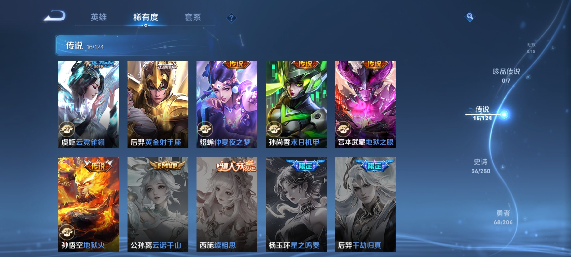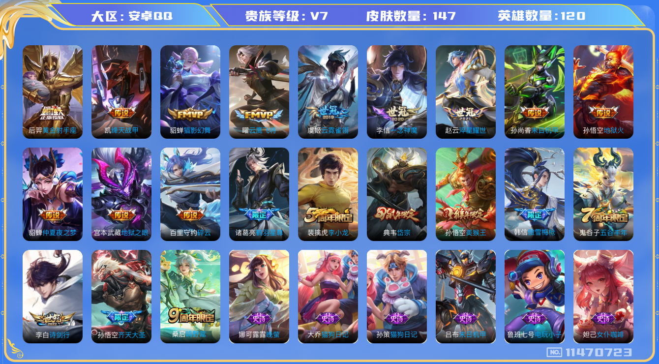 - [11632766]V7 1典藏 1珍品传说 6传说 123英雄 219皮肤 可修改实名 荣耀水晶:最初的交响(伽罗典藏) 珍品传说:时之奇旅-孙策 传说皮:乘龙·铭钟鼎(赵云年限),幻光神枪,山海·炽霜斩(李信年限),末日机甲-孙尚香(绿蚂蚱) 珍宝阁皮:万物之道,女武神 限定皮:愿照·九州拓(澜年限),逐霄战戟,鸣野蒿,五谷丰年,孙行者,寅虎·心曲(虎婆),唐三藏,山海·玄木吟(马可年限) 史诗皮:星界战将,茶境仙,龙之律动,蒙犽顽岩魄,芈月浮光幕影,怒海争锋,海诺心动手记,蔬乡物语(鲁班七号),琥珀纪元伽罗,化蝶舞,破空之剑,紫霞仙子,苍穹之光,千年之狐,真我赫兹(百里守约),高渐离燃音魔法,百解令(蒙犽),蒙恬荣光圣徽,偶像歌手,末日机甲-吕布,猫狗日记-孙策,节奏热浪,水果甜心,绅士熊喵,心灵骇客,时之奇旅-安琪拉,功夫厨神,鬼剑武藏,心灵战警,地狱岩魂,纤云弄巧,拒霜思,乘风破浪,逐浪之夏,箭羽风息,唤灵魅影,金属风暴,圣诞狂欢,鹰眼统帅,魅力维加斯,未来纪元-赵云