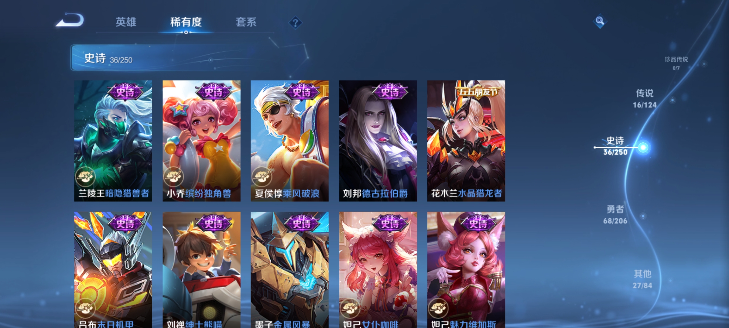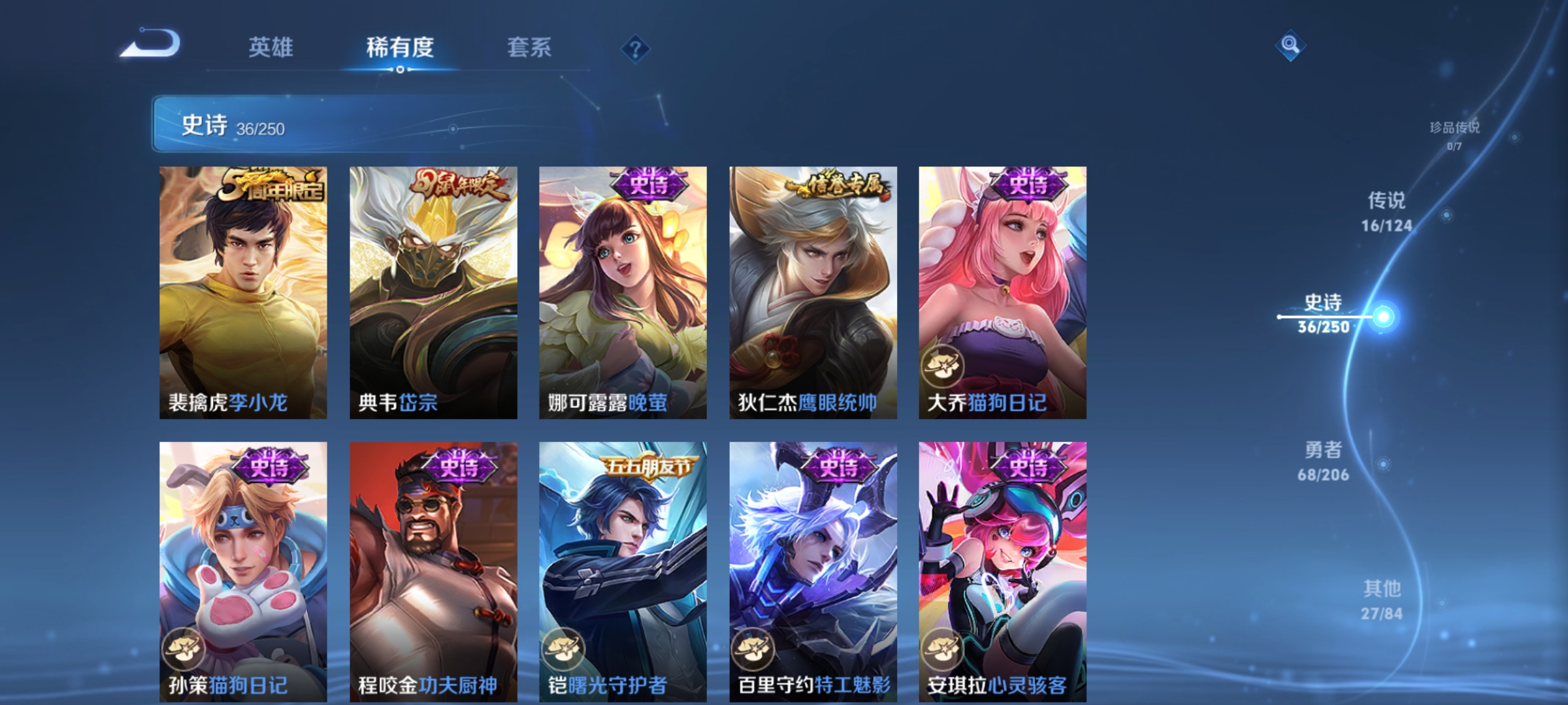 娜可露露晚萤,大乔猫狗日记,孙策猫狗日记,吕布末日机甲,鲁班七号电玩小子,刘禅绅士熊喵,安琪拉心灵骇客,程咬金功夫厨神,刘邦德古拉伯爵,兰陵王暗隐猎兽者,宫本武藏鬼剑武藏,小乔缤纷独角兽,夏侯惇乘风破浪,花木兰水晶猎龙者,铠曙光守护者,墨子金属风暴,百里守约特工魅影,嫦娥拒霜思,澜赏金猎手,刘禅电玩·爆裂旋风,百里守约真我赫兹,蒙犽百解令