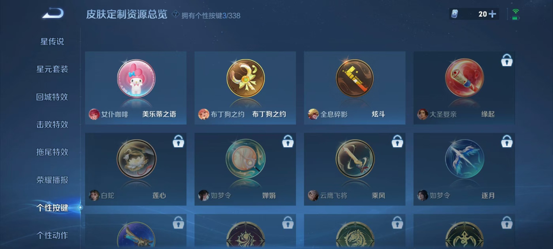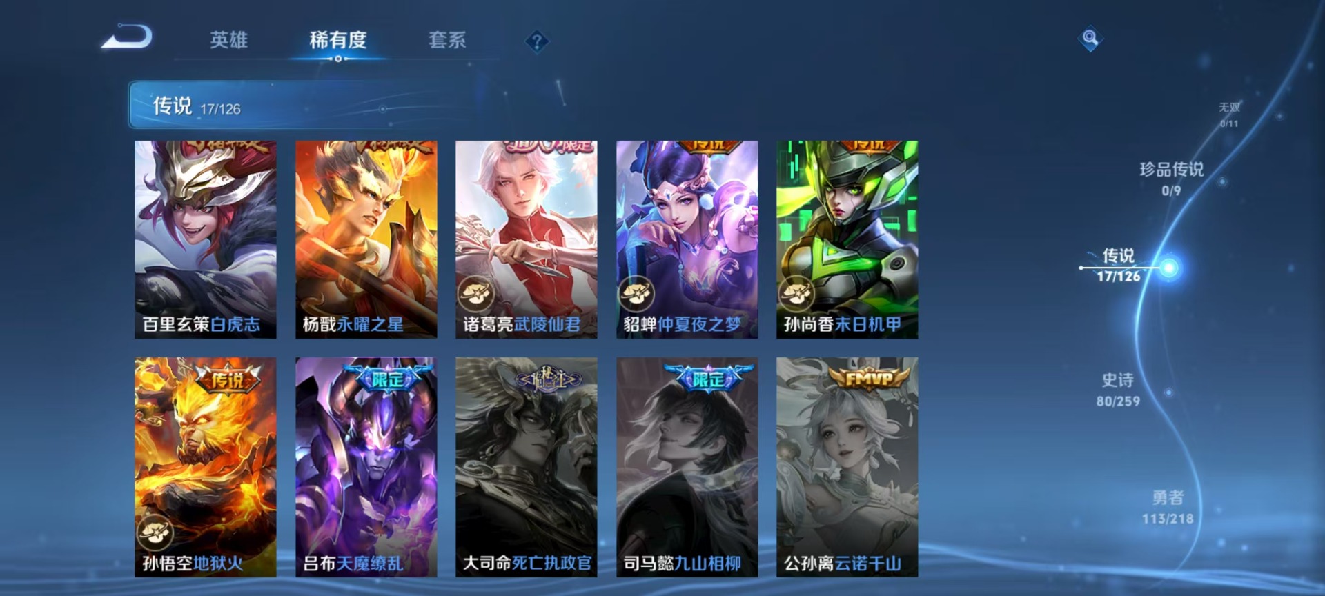 大乔白鹤梁神女,铠青龙志,伽罗天狼溯光者,伽罗太华,赵云百木心枪,赵云龙胆,典韦岱宗,孙尚香异界灵契,项羽霸王别姬,吕布御风骁将,露娜一生所爱,裴擒虎李小龙,东皇太一逐梦之光,上官婉儿梁祝,猪八戒猪悟能,孙悟空孙行者,孙悟空大圣娶亲,孙悟空至尊宝,芈月白晶晶,百里玄策白虎志,妲己愿照·众生和,虞姬霸王别姬,虞姬愿照·岁时盈,妲己热情桑巴,关羽冰锋战神