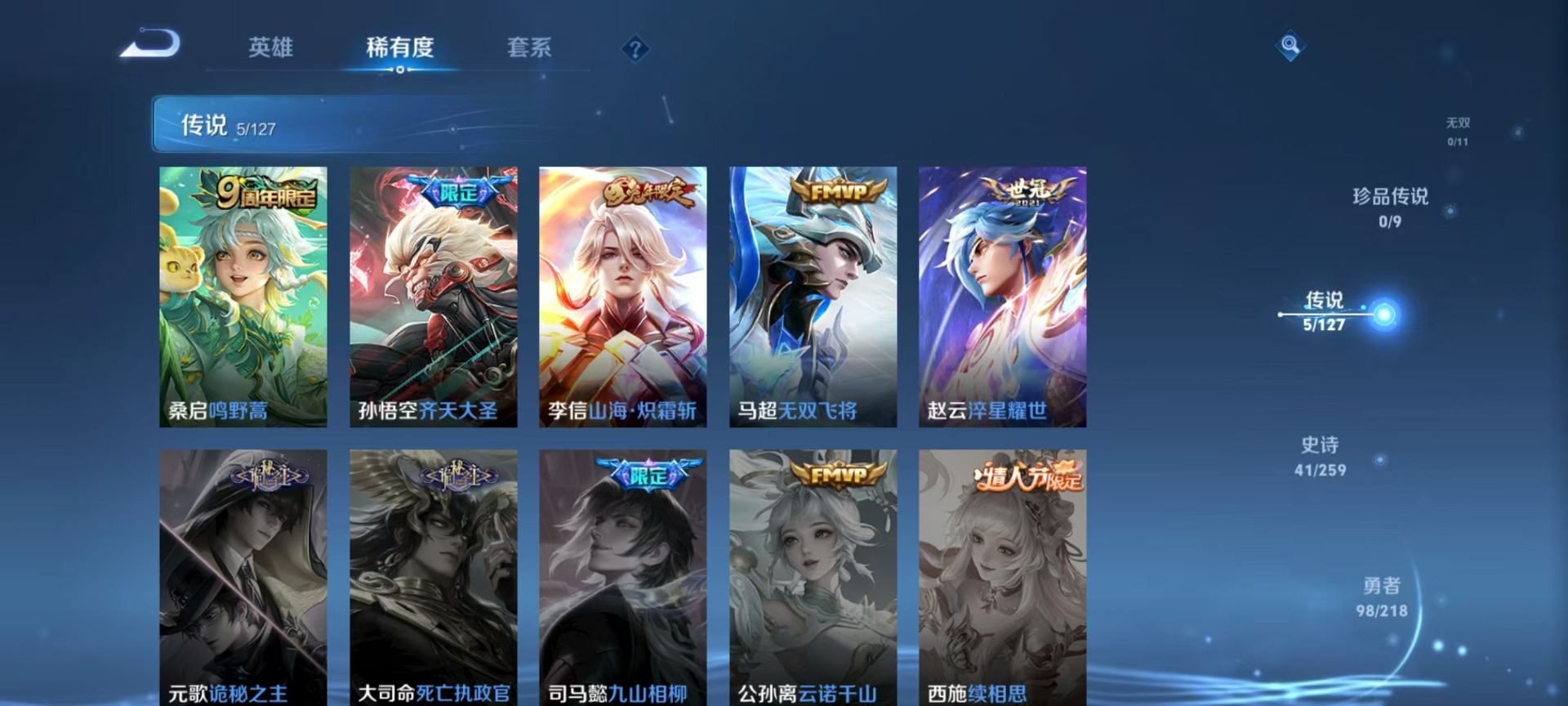 - [11881935]V7 2珍品传说 8传说 126英雄 274皮肤 典藏英雄武则天 可修改实名 优质装备:怪盗基德,黄金狮子座,黄金白羊座,炽阳神光,乞巧织情,百相守梦(张飞),灼幽烈阳,牧神诗旅 珍品传说:兔狲·蓬尾 珍宝阁皮:万物之道,优雅恋人 限定皮:鸣野蒿,玄嵩(庄周年限),山海·碧波行(瑶年限),高山流水,降魔,五谷丰年,虎魄,奔雷神使(牛魔年限),云端筑梦师,山海·玄木吟(马可年限) 史诗皮:鸭鸭历险记-刘禅,化蝶舞,星界战将,龙之律动,小牛鸭,百相守梦-周瑜,茶境仙,蒙犽顽岩魄,百相守梦-百里守约,百相守梦-黄忠,特工魅影,电玩·爆裂旋风,江河有灵,百解令(蒙犽),蒙恬荣光圣徽,冰冠公主,末日机甲-吕布,猫狗日记-大乔,时之恋人-孙尚香,乱世虎臣,节奏热浪,女仆咖啡,水果甜心,绅士熊喵,天才门将,星夜王子,德古拉伯爵,幽灵船长,鬼剑武藏,心灵战警,乐园奇幻夜,天秀·启明,地狱岩魂,纤云弄巧,拒霜思,缤纷独角兽,金属风暴,原初追逐者,圣诞狂欢,圣诞恋歌,鹰眼统帅,暗夜贵公子,魅力维加斯,黎明之约,无心,未来纪元-赵云