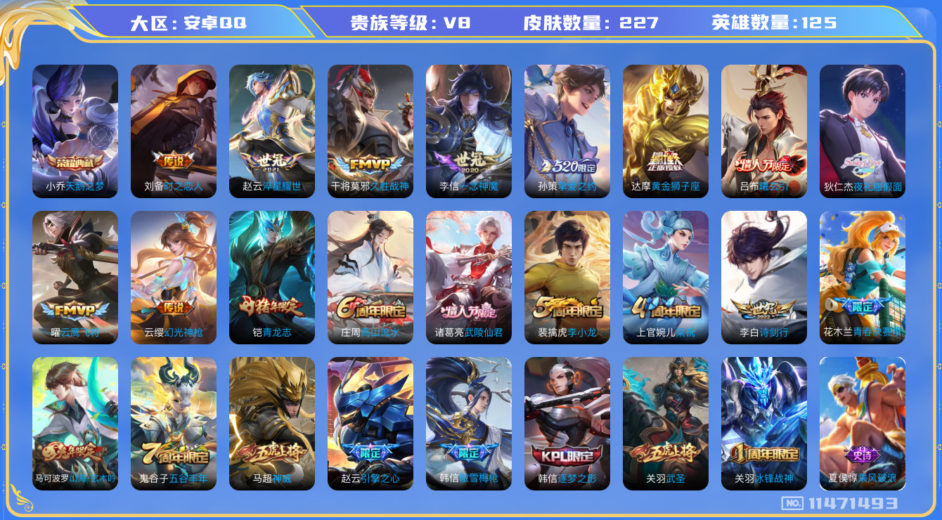 [11471493]V8 1典藏 14传说 125英雄 227皮肤 可修改实名 优质装备:天鹅之梦(小乔典藏),黄金狮子座,云鹰飞将(小将军),久胜战神,一念神魔,时之恋人-刘备(电焊工),淬星耀世,挚爱之约,夜礼服假面 传说皮:吕布曦玄引,幻光神枪 珍宝阁皮:优雅恋人,蔷薇恋人,玩趣恶龙 限定皮:武陵仙君(小桃花),傲雪梅枪,神威(电光马子),高山流水,诗剑行,五谷丰年,青龙志(铠年限),冰锋战神,武圣,梁祝,李小龙,逐梦之影,引擎之心,青春决赛季,山海·玄木吟(马可年限) 史诗皮:鸭鸭历险记-刘禅,化蝶舞,星界战将,龙之律动,石田雨龙,怒海争锋,谪仙醉月,百相守梦-黄忠,电玩小子(小书包),特工魅影,千年之狐,真我赫兹(百里守约),蒙恬荣光圣徽,偶像歌手,龙骑士(小龙虾),晚萤,末日机甲-吕布,猫狗日记-孙策,乱世虎臣,节奏热浪,修罗,摇滚巨星,水果甜心,天才门将,星夜王子,功夫厨神,暗隐猎兽者,幽灵船长,鬼剑武藏,心灵战警,天秀·启明,舞动绿茵,地狱岩魂,纤云弄巧,繁星吟游(呼啦呼啦),拒霜思,乘风破浪,水晶猎龙者,曙光守护者,金属风暴,原初追逐者,圣诞狂欢,圣诞恋歌,鹰眼统帅,暗夜贵公子,魅力维加斯,黎明之约,赏金猎手,无心,未来纪元-赵云