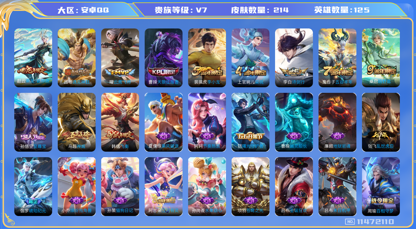 [11472110]V7 5传说 125英雄 214皮肤 可修改实名 传说皮:乘龙·铭钟鼎(赵云年限),云鹰飞将(小将军),遇见神鼓 珍宝阁皮:妄想食味,蔷薇恋人 限定皮:鸣野蒿,至尊宝,神威(电光马子),飞衡(韩信年限),诗剑行,五谷丰年,梁祝,天狼征服者,李小龙 史诗皮:鸭鸭历险记-刘禅,龙之律动,琥珀纪元伽罗,百相守梦-周瑜,苍穹之光,黄金分割率,永昼,江河有灵,冰冠公主,龙骑士(小龙虾),末日机甲-吕布,猫狗日记-孙策,乱世虎臣,节奏热浪,摇滚巨星,水果甜心,绅士熊喵,天才门将,星夜王子,心灵骇客,暗隐猎兽者,幽灵船长,天秀·启明,舞动绿茵,地狱岩魂,纤云弄巧,繁星吟游(呼啦呼啦),缤纷独角兽,乘风破浪,逐浪之夏,水晶猎龙者,曙光守护者,圣诞狂欢,圣诞恋歌,鹰眼统帅,暗夜贵公子,魅力维加斯,无心,未来纪元-赵云