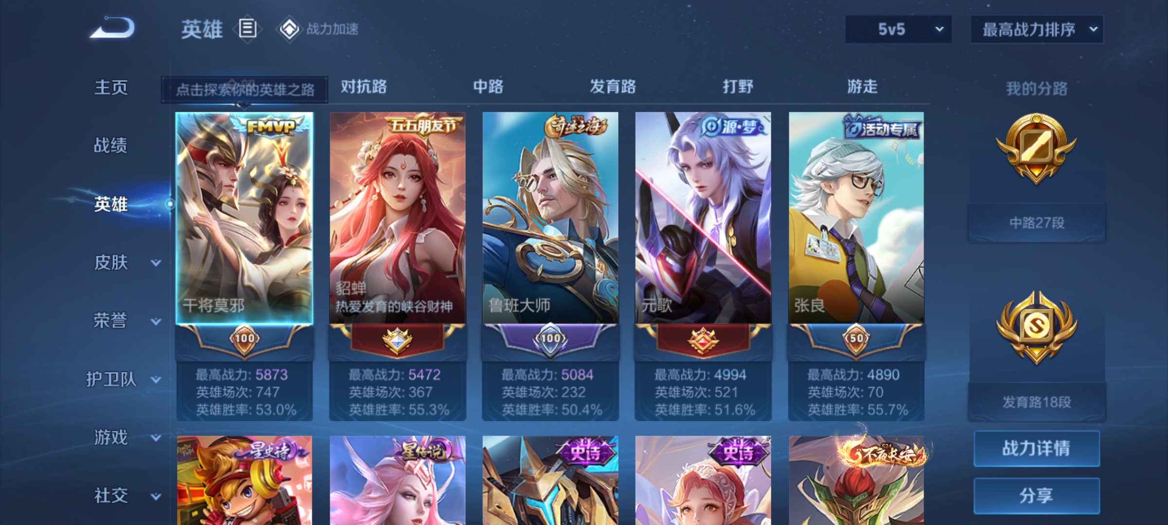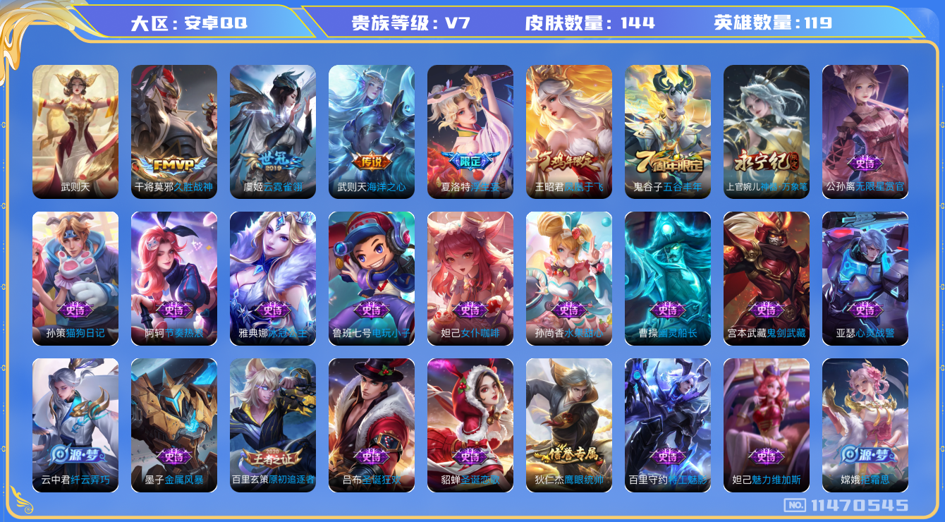 - [12265297]实名: 可修改 贵族等级: V7 英雄数: 124 皮肤数: 192 珍品传说: 时之奇旅-孙策 传说皮: 黄金狮子座,地狱之眼,时之恋人-刘备,超时空战士-狄仁杰 限定皮: 李小龙,武圣,岱宗,高山流水,猪悟能,傲雪梅枪,五谷丰年,齐天大圣,鸣野蒿,愿照·九州拓