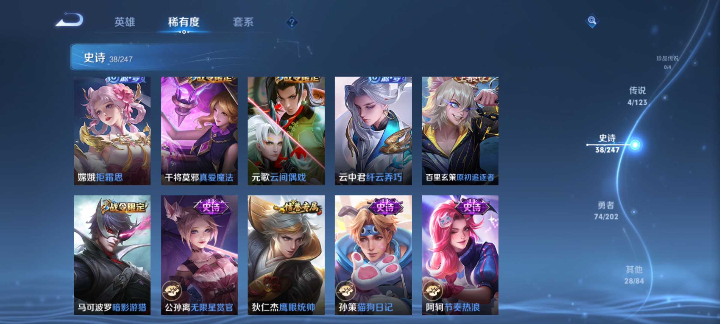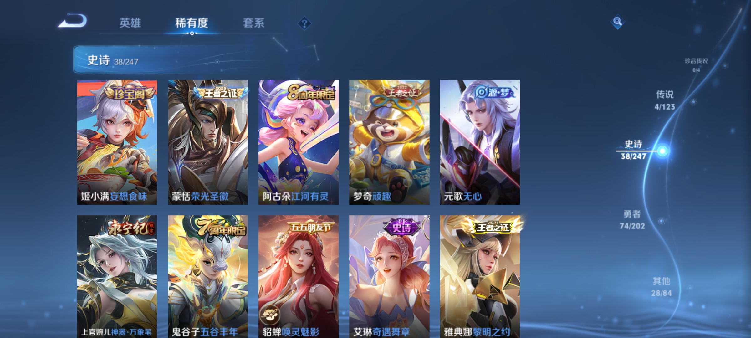 曹操烛龙,芈月重明,典韦穷奇,狂铁御狮,米莱狄御霄,牛魔御旌,夏侯惇朔风刀,明世隐疑决卦,老夫子醍醐杖,鬼谷子原初探秘者,狄仁杰万华元夜,程咬金演武夺筹,钟馗驱傩正仪,苏烈千军破阵,马可波罗暗影游猎,元歌云间偶戏,弈星混沌棋,达摩沙漠行僧,兰陵王金庭之子,沈梦溪大漠名商,李元芳云中旅人,桑启海盐诗旅,裴擒虎擒涛扼浪,鲁班大师探海日志,张良古海寻踪