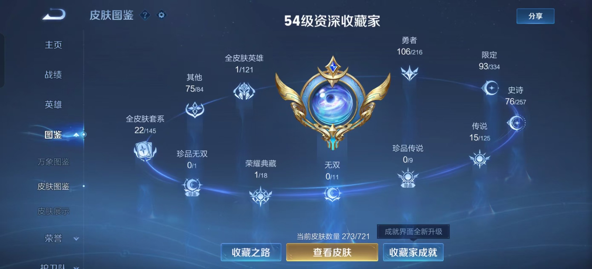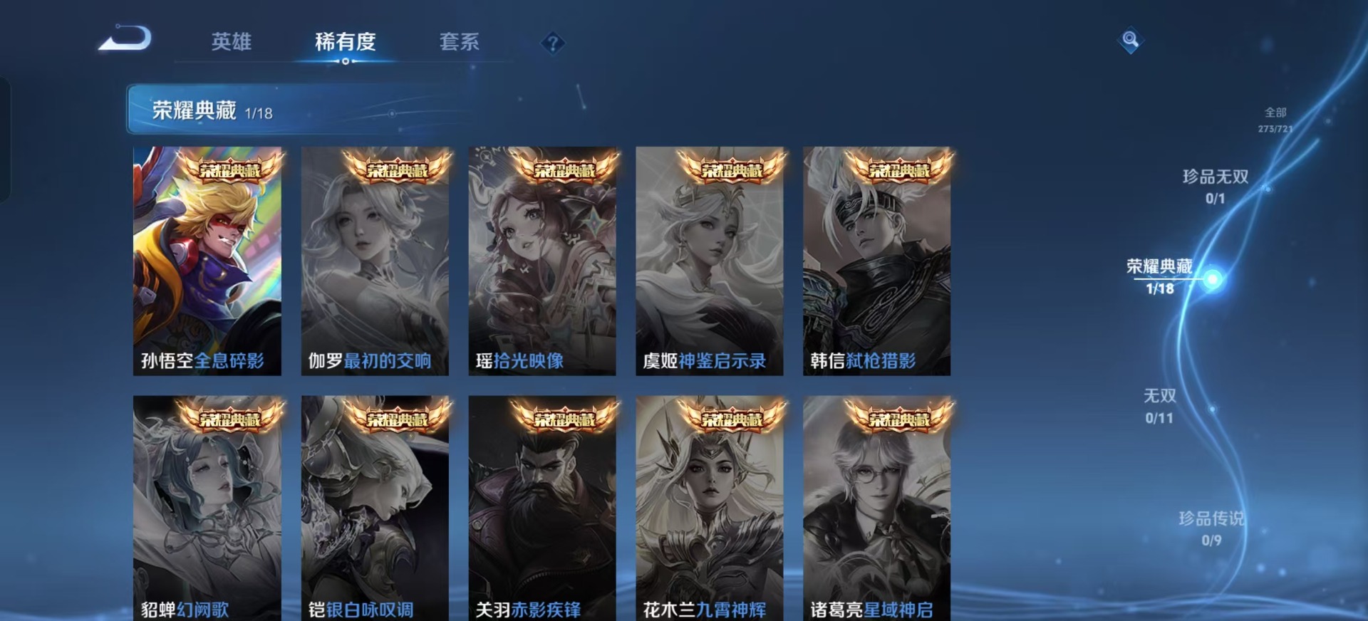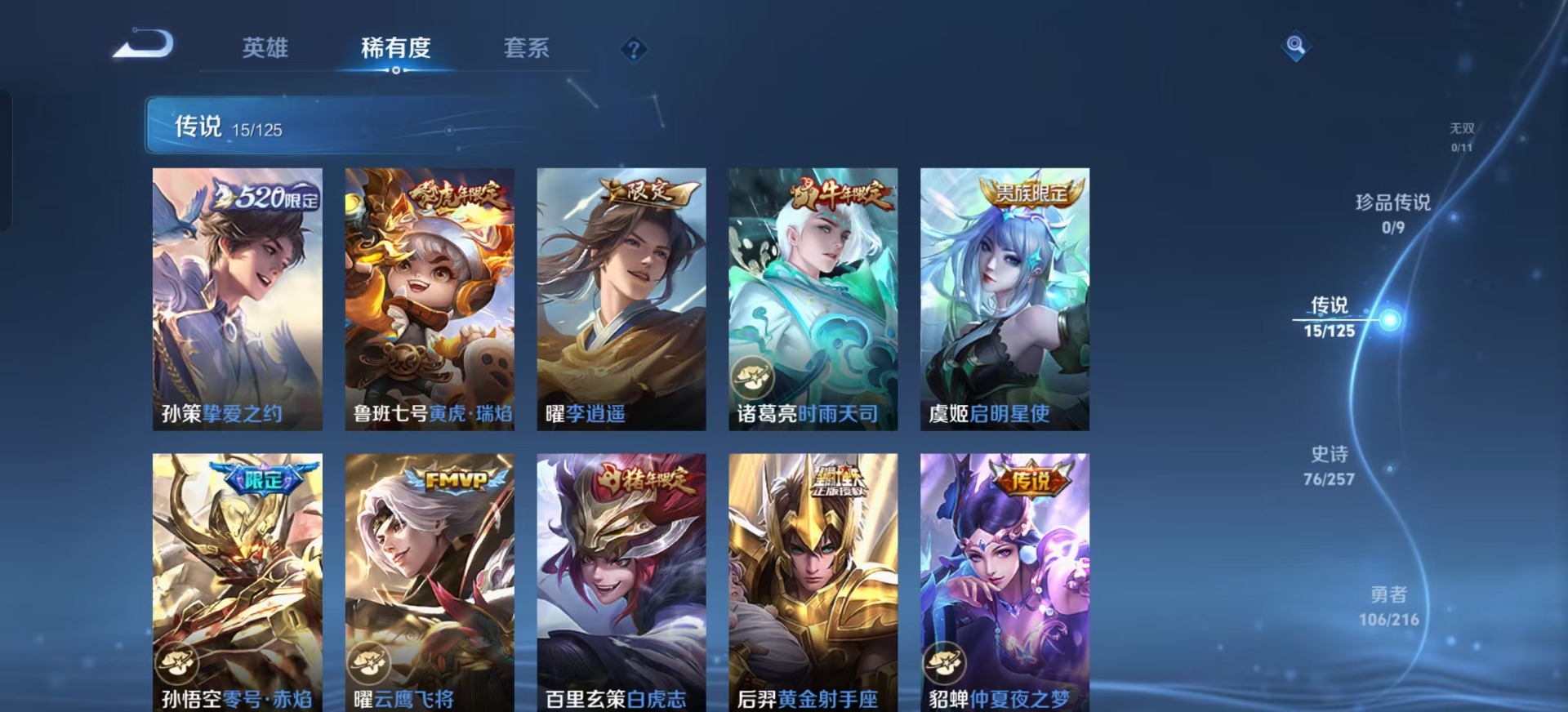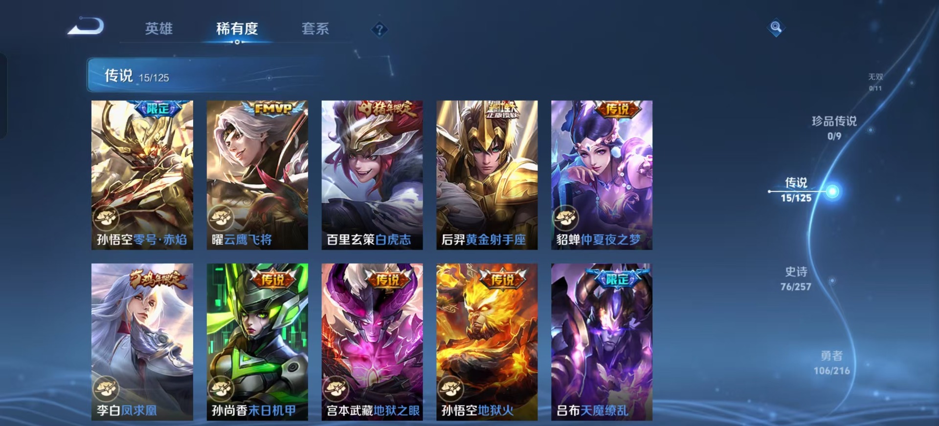 - PX_2093848-实名: 可修改 贵族等级: V7 英雄数: 123 皮肤数: 249 荣耀水晶: 星域神启 珍品传说: 怪盗基德,器灵·落星盏 传说皮: 久胜战神,一念神魔,乞巧织情,铠冥王哈迪斯 限定皮: 李小龙,梁祝,神威,至尊宝,孙行者,五谷丰年,鸣野蒿,陌上桑,愿照·山河定
