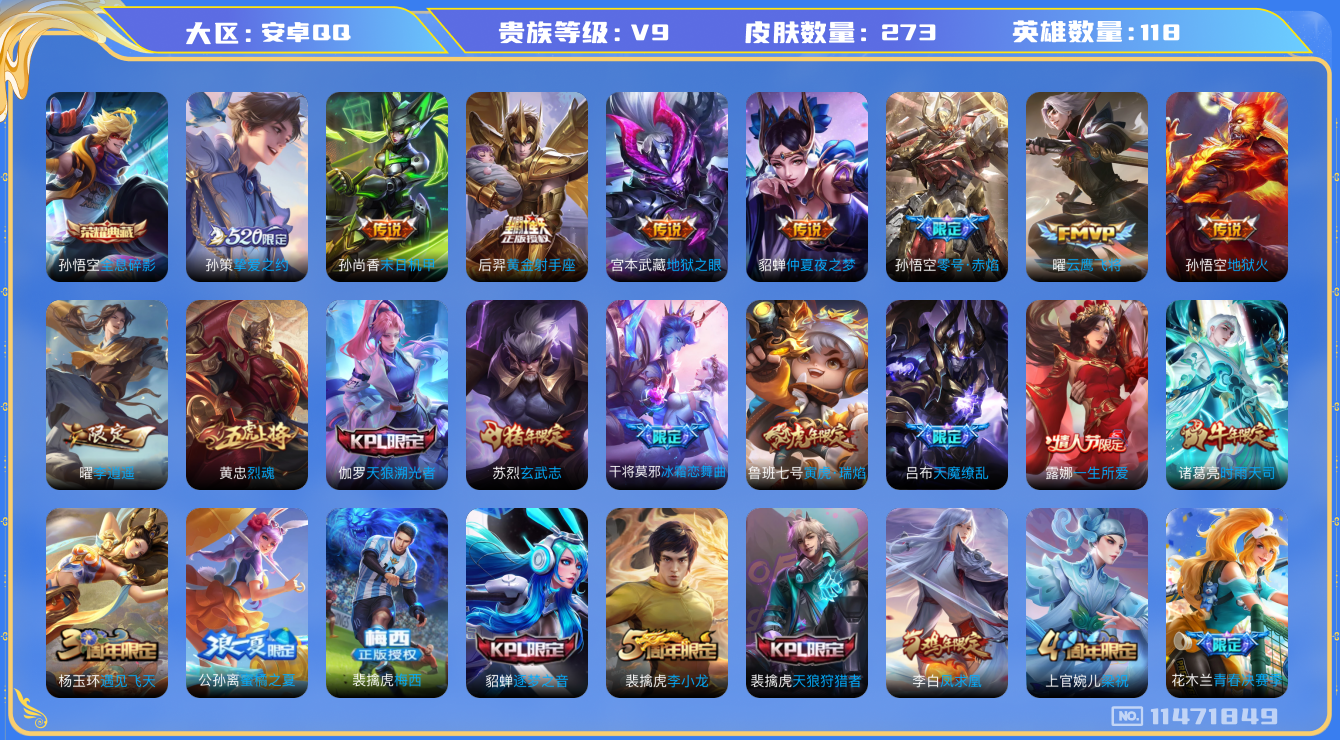 [11471849]V9 1典藏 15传说 118英雄 273皮肤 可修改实名 荣耀水晶:全息碎影(猴子典藏) 传说皮:李逍遥,黄金射手座,零号·赤焰,地狱火,仲夏夜之梦(大飞蛾),地狱之眼,末日机甲-孙尚香(绿蚂蚱),云鹰飞将(小将军),挚爱之约 珍宝阁皮:玩趣恶龙 限定皮:至尊宝,白虎志(电光耗子),凤求凰(白切鸡),梅西,傲雪梅枪,白晶晶,时雨天司(水龙头),飞衡(韩信年限),山海·碧波行(瑶年限),遇见飞天,五谷丰年,冰锋战神,梁祝,天狼狩猎者,逐梦之星,烈魂,天狼溯光者,逐梦之音,李小龙,逐梦之影,玄武志(苏烈年限),一生所爱,大圣娶亲,引擎之心,天魔缭乱,青春决赛季,冰霜恋舞曲,蜜橘之夏,美猴王,寅虎·瑞焰(虎皮蛋子) 史诗皮:苍穹之光,白龙吟,黄金分割率,特工魅影,千年之狐,偶像歌手,晚萤,魅语,暗夜猫娘,乱世虎臣,节奏热浪,修罗,女仆咖啡,摇滚巨星,水果甜心,绅士熊喵,天才门将,星夜王子,心灵骇客,德古拉伯爵,幽灵船长,鬼剑武藏,心灵战警,舞动绿茵,地狱岩魂,纤云弄巧,繁星吟游(呼啦呼啦),缤纷独角兽,乘风破浪,逐浪之夏,水晶猎龙者,曙光守护者,金属风暴,原初追逐者,圣诞狂欢,鹰眼统帅,魅力维加斯,未来纪元-赵云