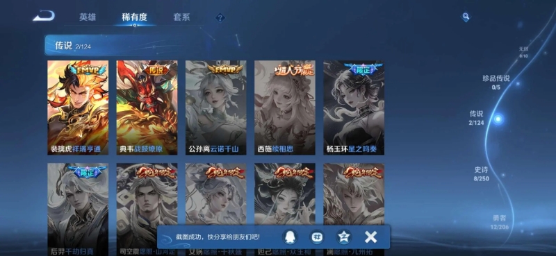 - PX_2096140-23 安卓QQ/非凡王者/312皮肤/125英雄/1典藏/0珍品无双/1无双/1珍品传说/28传说/85史诗/9稀有英雄 【1 珍品传说】器灵·落星盏 嫦娥, 【1 典藏皮肤】全息碎影 孙悟空, 【1 无双皮肤】器灵·螭龙剑 曜, 【28 传说皮肤】胖达荣荣 梦奇,启明星使 虞姬,逐花归海 澜,无双飞将 马超,云鹰飞将 曜,凤求凰 李白,浮生妄 夏洛特,地狱之眼 宫本武藏,祈