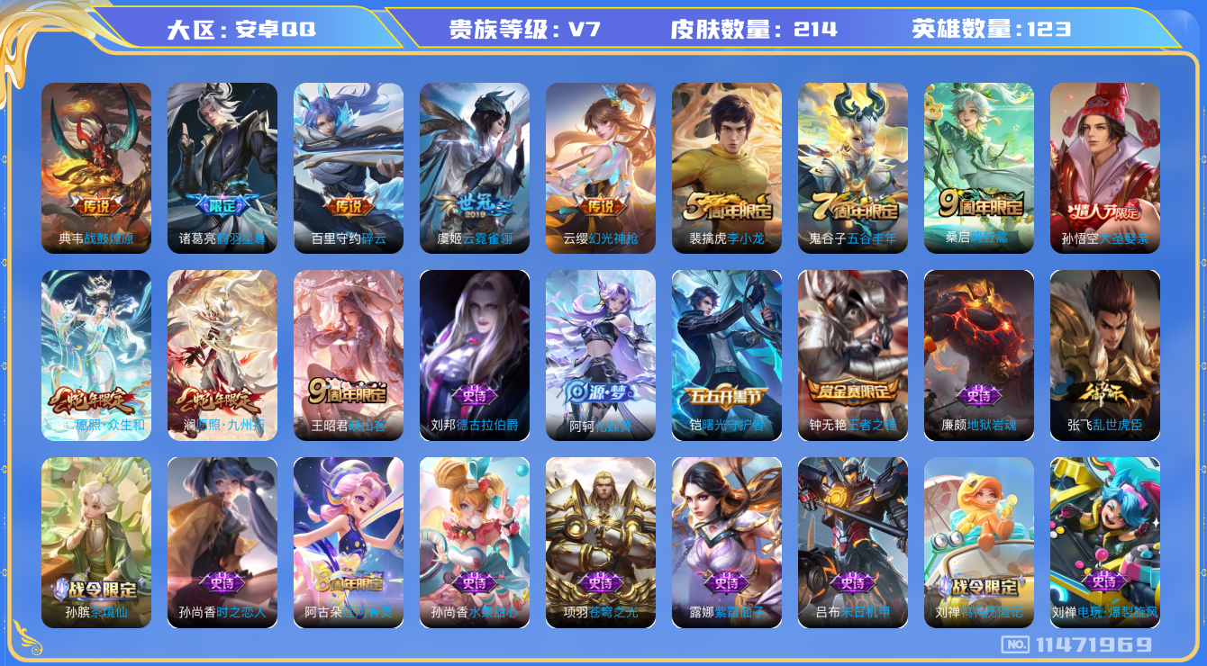 [11471969]V7 9传说 123英雄 214皮肤 可修改实名 优质装备:云霓雀翎,碎云,鹤羽星尊 传说皮:典韦战鼓燎原,幻光神枪 珍宝阁皮:蔷薇恋人,玩趣恶龙 限定皮:愿照·九州拓(澜年限),愿照·众生和(妲己年限),映山客,鸣野蒿,五谷丰年,李小龙,大圣娶亲 史诗皮:鸭鸭历险记-刘禅,化蝶舞,龙之律动,茶境仙,破空之剑,百相守梦-百里守约,紫霞仙子,苍穹之光,特工魅影,千年之狐,电玩·爆裂旋风,江河有灵,冰冠公主,末日机甲-吕布,时之恋人-孙尚香,乱世虎臣,摇滚巨星,水果甜心,天才门将,星夜王子,心灵骇客,功夫厨神,德古拉伯爵,鬼剑武藏,舞动绿茵,地狱岩魂,繁星吟游(呼啦呼啦),逐浪之夏,曙光守护者,金属风暴,原初追逐者,圣诞恋歌,鹰眼统帅,王者之锤,魅力维加斯,黎明之约,无心,未来纪元-赵云
