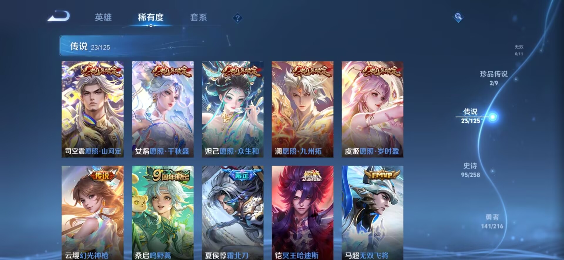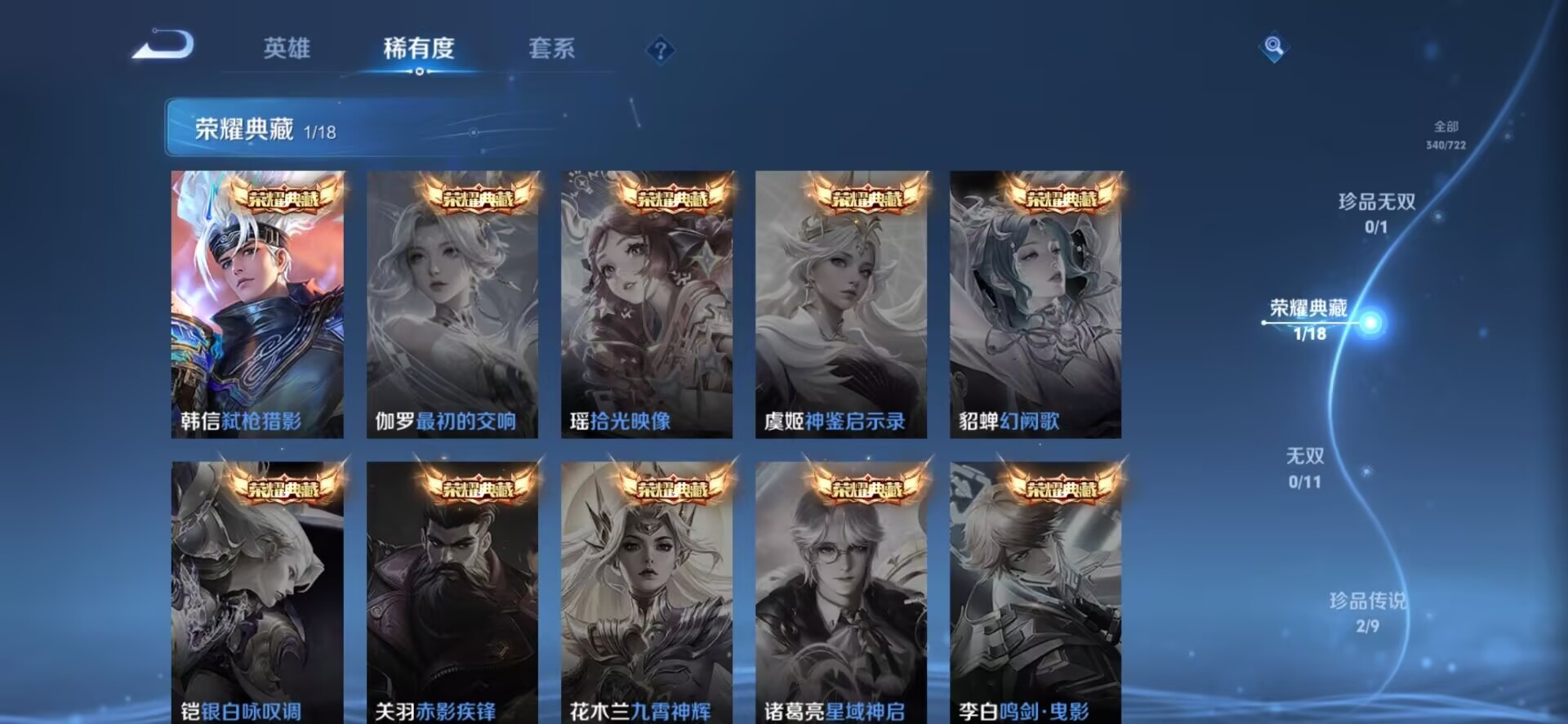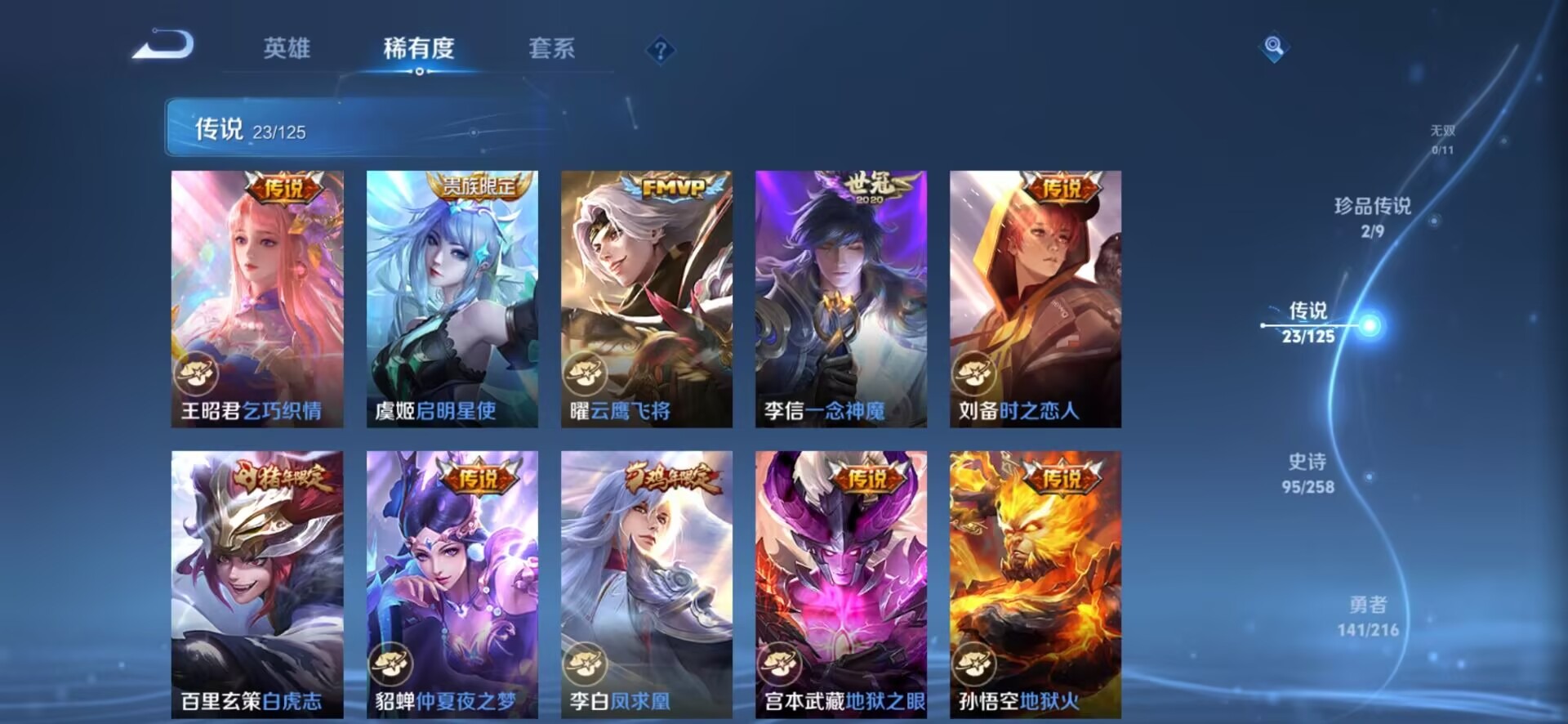 - PX_2109891-Q/至尊星耀/345皮肤/125英雄/2典藏/0珍品无双/0无双/0珍品传说/22传说/110史诗/9稀有英雄 【2 典藏皮肤】倪克斯神谕 武则天,幻阙歌 貂蝉, 【22 传说皮肤】武圣 关羽,启明星使 虞姬,云霓雀翎 虞姬,时之祈愿 瑶,白虎志 百里玄策,补天 女娲,凤求凰 李白,猫影幻舞 貂蝉,仲夏夜之梦 貂蝉,武陵仙君 诸葛亮,海洋之心 武则天,时雨天司 诸葛亮,寅虎·