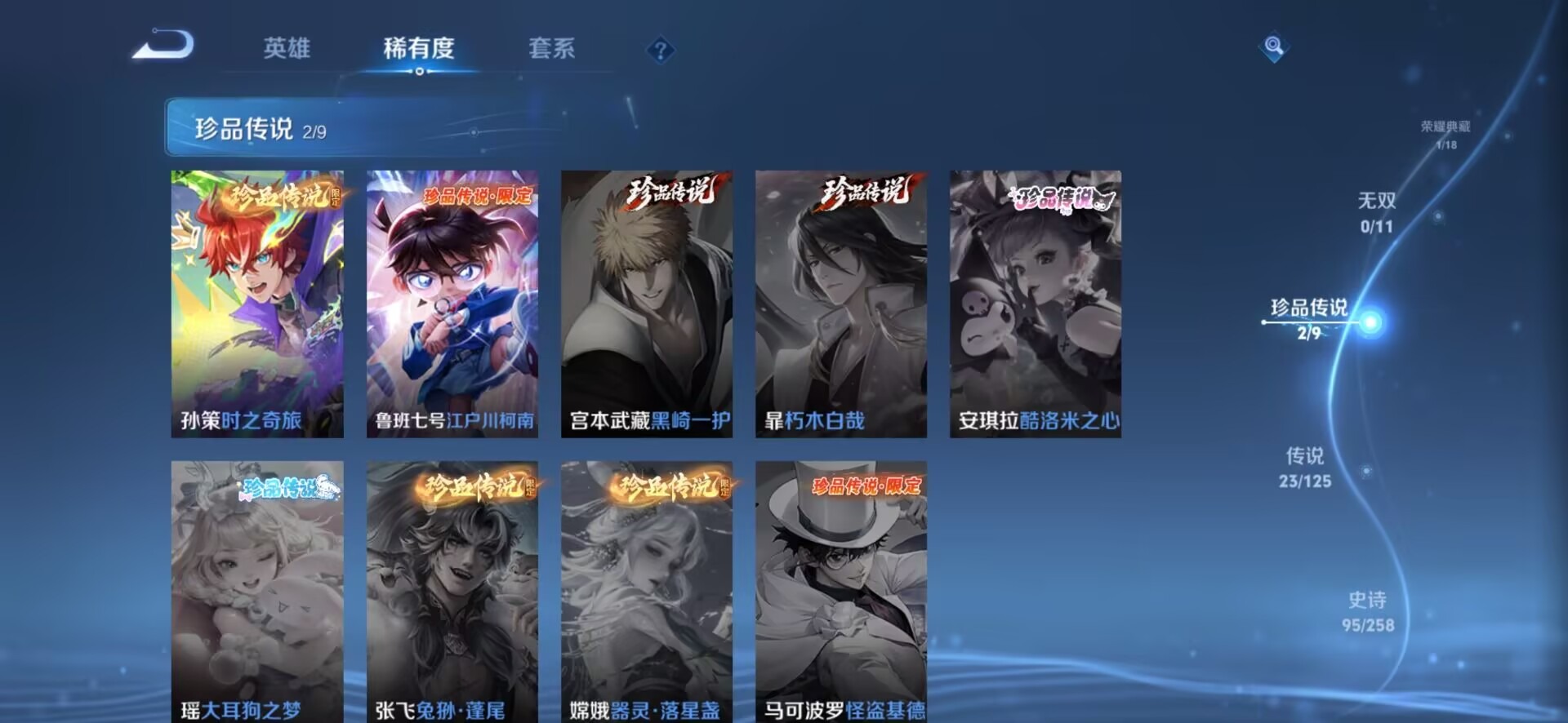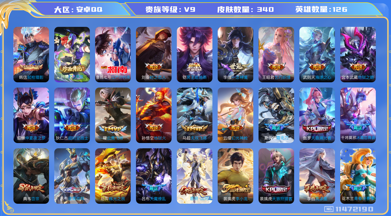 [11472190]V9 1典藏 2珍品传说 23传说 126英雄 340皮肤 典藏英雄武则天 可修改实名 荣耀水晶:弑枪猎影(韩信典藏) 珍品传说:江户川柯南,时之奇旅-孙策 传说皮:铠冥王哈迪斯,幻光神枪,地狱火,仲夏夜之梦(大飞蛾),海洋之心,地狱之眼,一念神魔,云鹰飞将(小将军),无双飞将,乞巧织情,时之恋人-刘备(电焊工),超时空战士-狄仁杰 珍宝阁皮:妄想食味 限定皮:愿照·九州拓(澜年限),愿照·岁时盈(虞姬年限),愿照·山河定(司空震年限),愿照·众生和(妲己年限),愿照·千秋盛(女娲年限),逐霄战戟,陌上桑,鸣野蒿,夏侯惇霜北刀,至尊宝,白虎志(电光耗子),凤求凰(白切鸡),魔法小厨娘,飞衡(韩信年限),至美·乘鲤谣,天狼狩猎者,逐梦之星,岱宗(典韦年限),天狼溯光者,李小龙,辉光之辰,猪悟能,大圣娶亲,天魔缭乱,青春决赛季,冰霜恋舞曲,神奇女侠 史诗皮:星界战将,茶境仙,器灵·浮梦炉,龙之律动,石田雨龙,百相守梦-百里守约,百相守梦-黄忠,戍鼓铭心,东方月初,蒙犽顽岩魄,埋骨钱,海诺心动手记,百相守梦-周瑜,化蝶舞,破空之剑,紫霞仙子,苍穹之光,黄金分割率,特工魅影,千年之狐,永昼,冰冠公主,青蛇,偶像歌手,晚萤,魅语,末日机甲-吕布,猫狗日记-孙策,猫狗日记-大乔,时之恋人-孙尚香,乱世虎臣,节奏热浪,修罗,女仆咖啡,摇滚巨星,水果甜心,绅士熊喵,天才门将,星夜王子,心灵骇客,功夫厨神,德古拉伯爵,暗隐猎兽者,幽灵船长,鬼剑武藏,暗渊魔法,心灵战警,乐园奇幻夜,天秀·启明,舞动绿茵,地狱岩魂,纤云弄巧,缤纷独角兽,乘风破浪,逐浪之夏,水晶猎龙者,曙光守护者,箭羽风息,金属风暴,圣诞狂欢,圣诞恋歌,鹰眼统帅,暗夜贵公子,魅力维加斯,赏金猎手,未来纪元-赵云